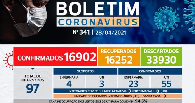 A taxa de ocupação dos leitos especiais para COVID-19 de UTI/SUS adulto está em 94,6% (35 adultos estão internados). Neste momento a cidade opera com 37 leitos de UTI/SUS para adultos, sendo 27 na Santa Casa e 10 no Hospital Universitário (HU).