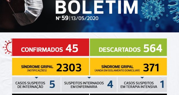 Dos 45 casos positivos, 31 pessoas apresentaram Síndrome Gripal e não foram internadas, 14 pessoas precisaram de internação devido a COVID-19, 9 receberam alta hospitalar, 2 casos positivos continuam internados e 3 casos positivos foram a óbito.