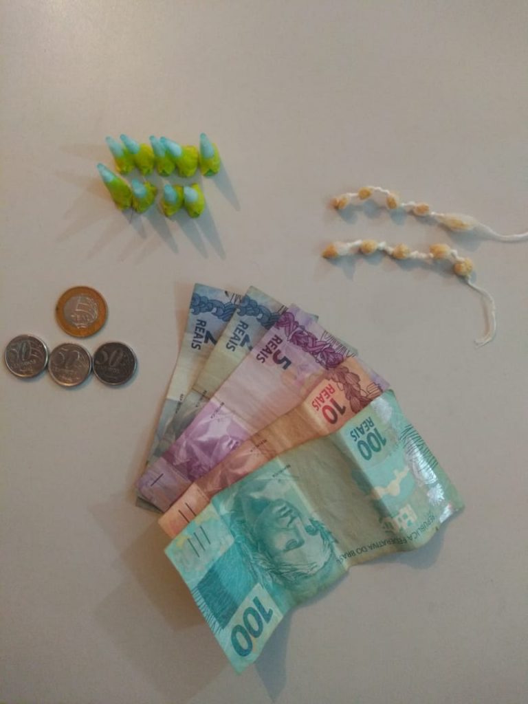 Com o menor os policiais localizaram R$ 21,50. Na terra foram localizados cem reais, 9 pinos de cocaína e 10 pedras de crack. O jovem foi encaminhado à Delegacia de Investigações Sobre Entorpecentes, ficando à disposição da justiça.