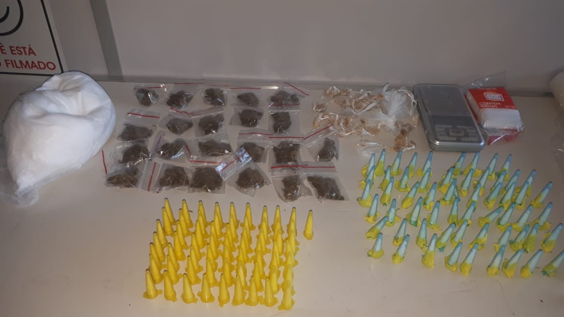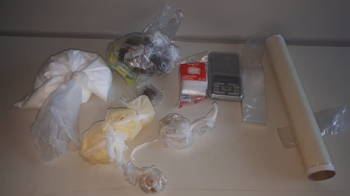 Segundo informações, a equipe estava em patrulhamento, quando um indivíduo jogou uma sacola ao solo e correu para dentro do quintal. A equipe desembarcou e foi no seu encalço , em ato contínuo equipe logrou êxito em aborda-lo. O indivíduo investiu contra a equipe tentando agredir os policiais e também ecitando população. Foi preciso o uso de força para conter o mesmo. Dentro da sacola continha 64 pinos de substâncias análogas a cocaína e 46 pedras de crack prontas para venda,. No interior da sua residência foram localizados dentro de uma gaveta 22 porções de maconha, 61 pinos de cocaína,apretecho para embalagem, balança de precisão dentro de uma saco plástico continha substância branca em pó( mandando para constatação).