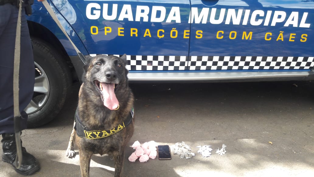 Durante patrulhamento preventivo pela Rua Doutor Procópio de Toledo Malta, nesta terça-feira, 20/04/2021, a equipe do Canil da GM, fez diligência com a Kiara e localizou droga na praça pública.