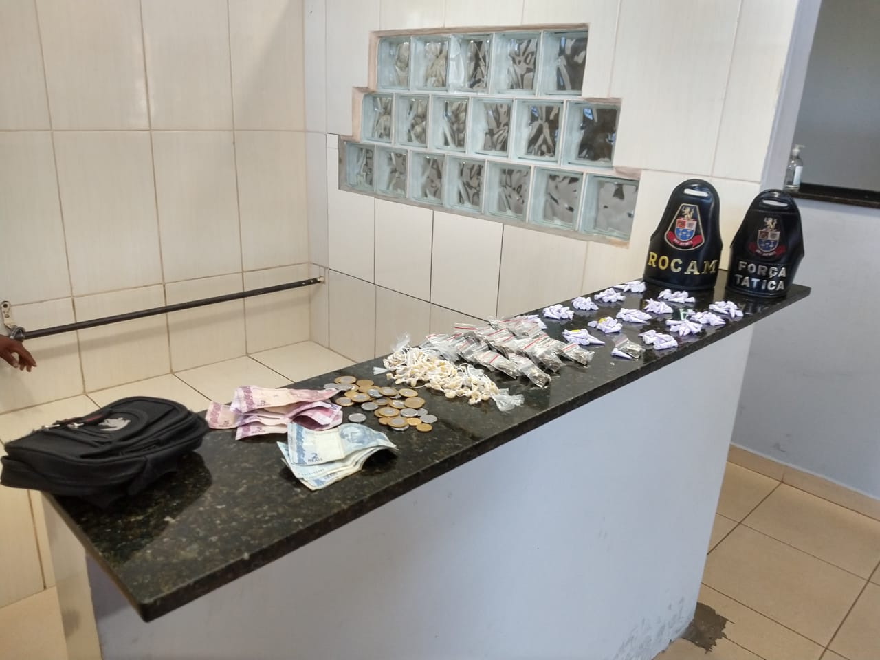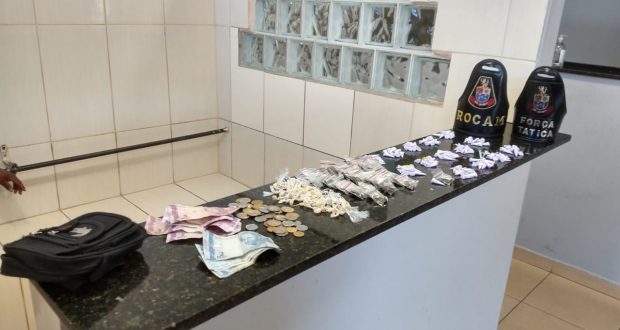 Segundo informações, policiais militares da Força Tática e ROCAM estavam em operação pelo local, quando se depararam com o indivíduo. Este saiu correndo e jogou no chão uma pochete contendo drogas. O mesmo foi abordado e conduzido ao Plantão Policial, autuado em flagrante por tráfico de drogas e recolhido ao Centro de Triagem.