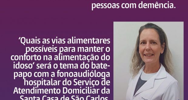 ‘Quais as vias alimentares possíveis para manter o conforto na alimentação do idoso’ será o tema do bate-papo com a fonoaudióloga hospitalar do Serviço de Atendimento Domiciliar da Santa Casa de São Carlos, Priscilla Velloso.