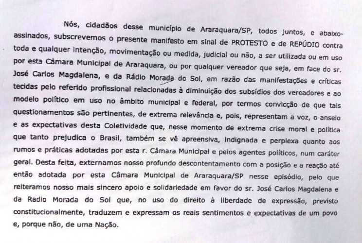 A ação movida pelos vereadores contra o jornalista provocou uma reação. Ouvintes, lideranças populares e movimentos sociais organizaram um abaixo-assinado, destinado ao presidente da Câmara de Araraquara, Jéferson Yashuda, em sinal de “protesto e de repúdio contra a intenção”, judicial ou não, em razão das críticas tecidas pelo profissional relacionadas à diminuição dos subsídios dos vereadores e ao modelo político em âmbito municipal ou federal, conforme consta no texto que acompanha as assinaturas.