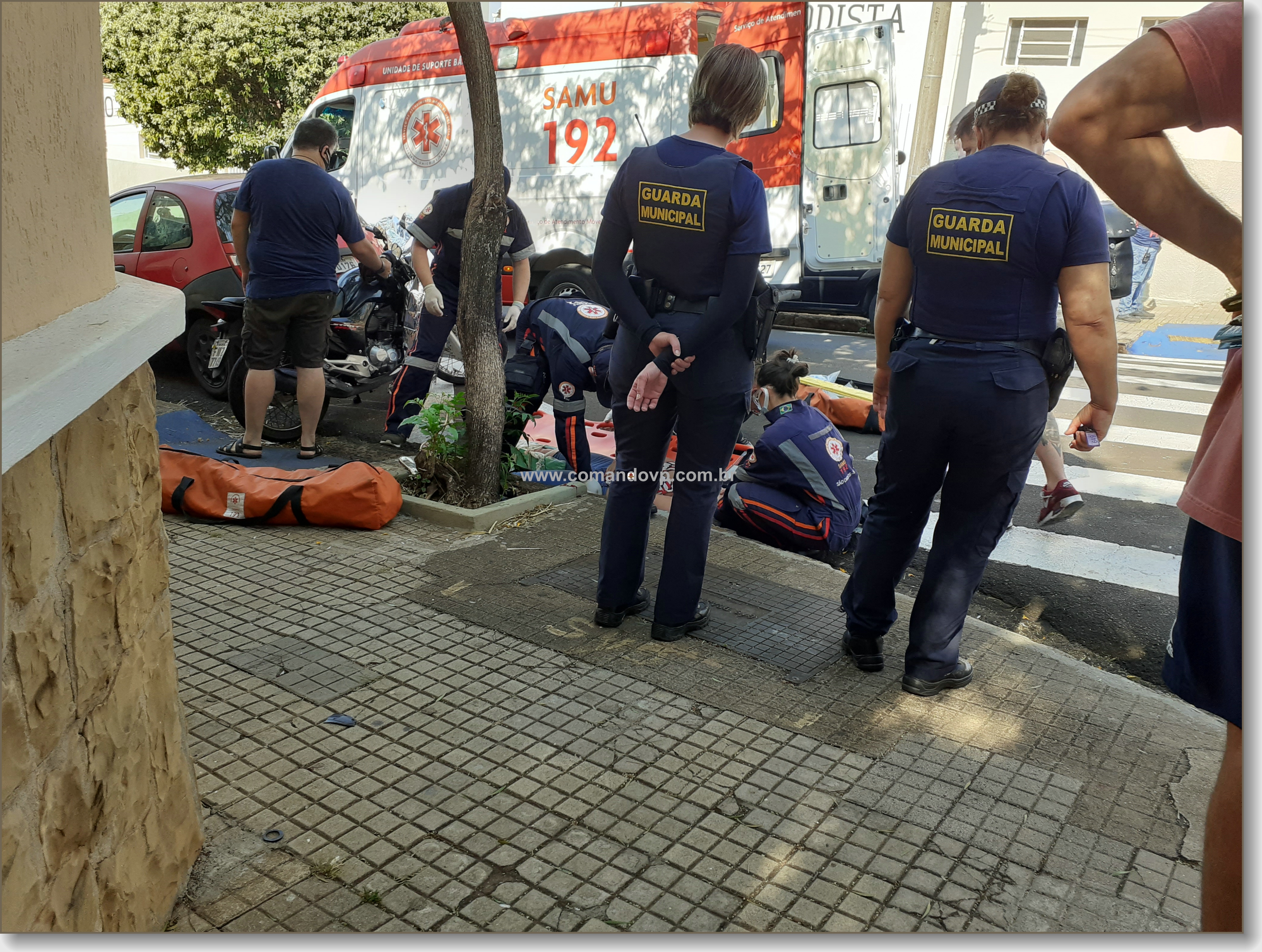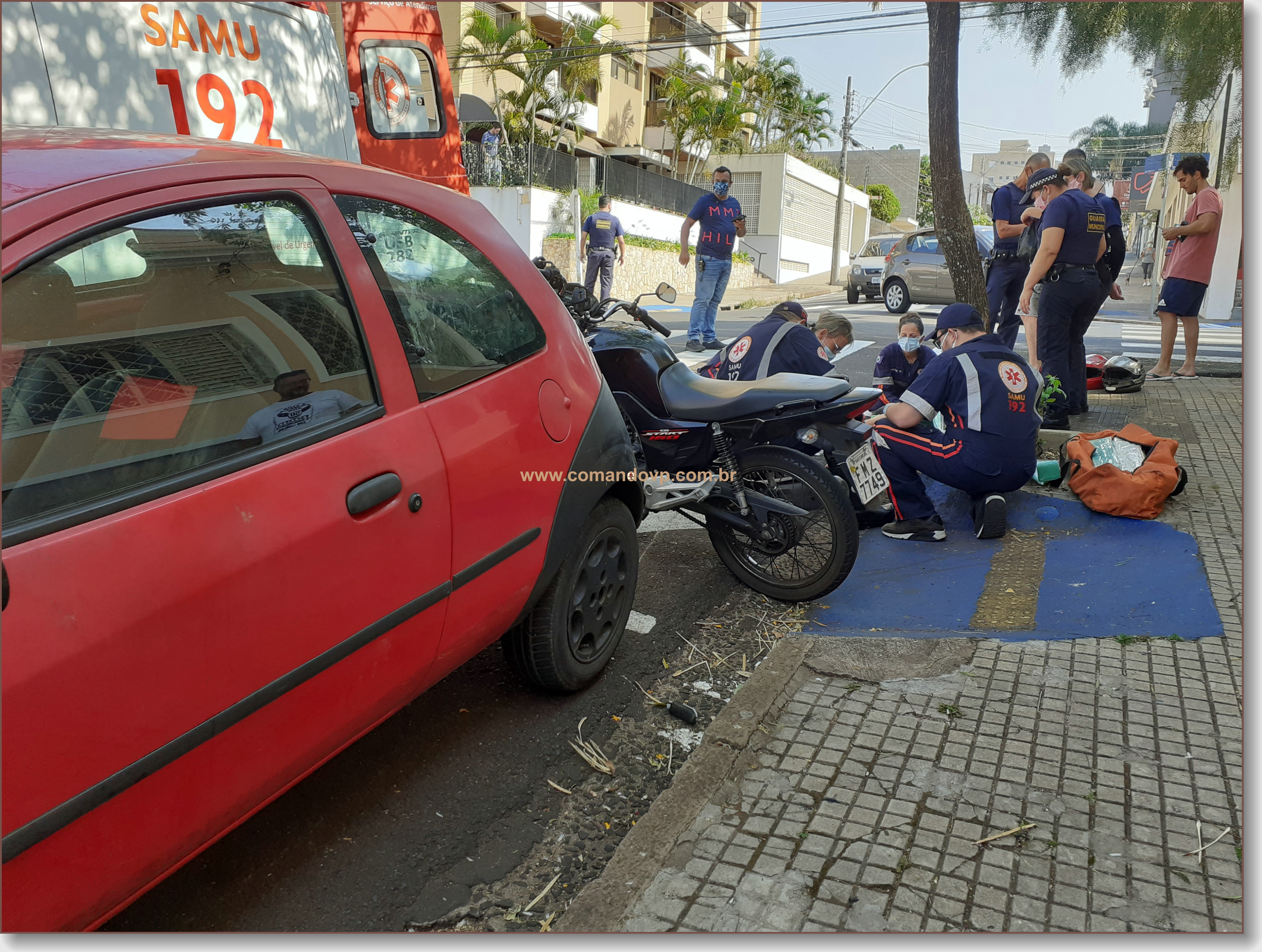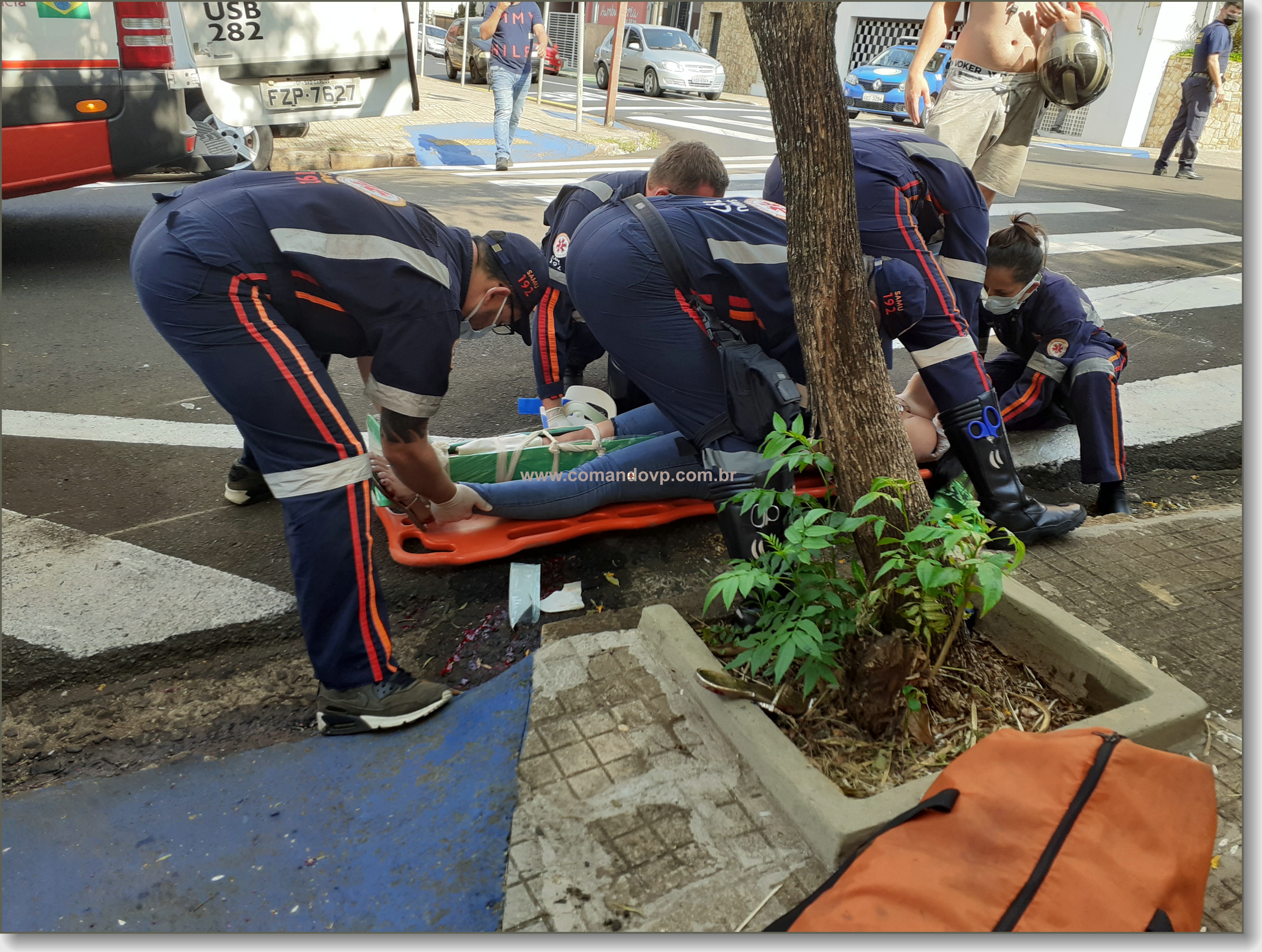 Com a colisão o casal foi lançado para frente e a jovem atingiu uma árvore. A Guarda Municipal passava pelo local e prestou os primeiros atendimentos. O SAMU foi acionado e duas ambulâncias estiveram presentes. Devido o ferimento grave que a jovem sofreu na perna direita, ela foi socorrida pela Unidade de Suporte Avançado ( USA) e encaminhada à Santa Casa. O condutor da moto aparentemente nada sofreu. O motorista do carro parou e também nada sofreu.