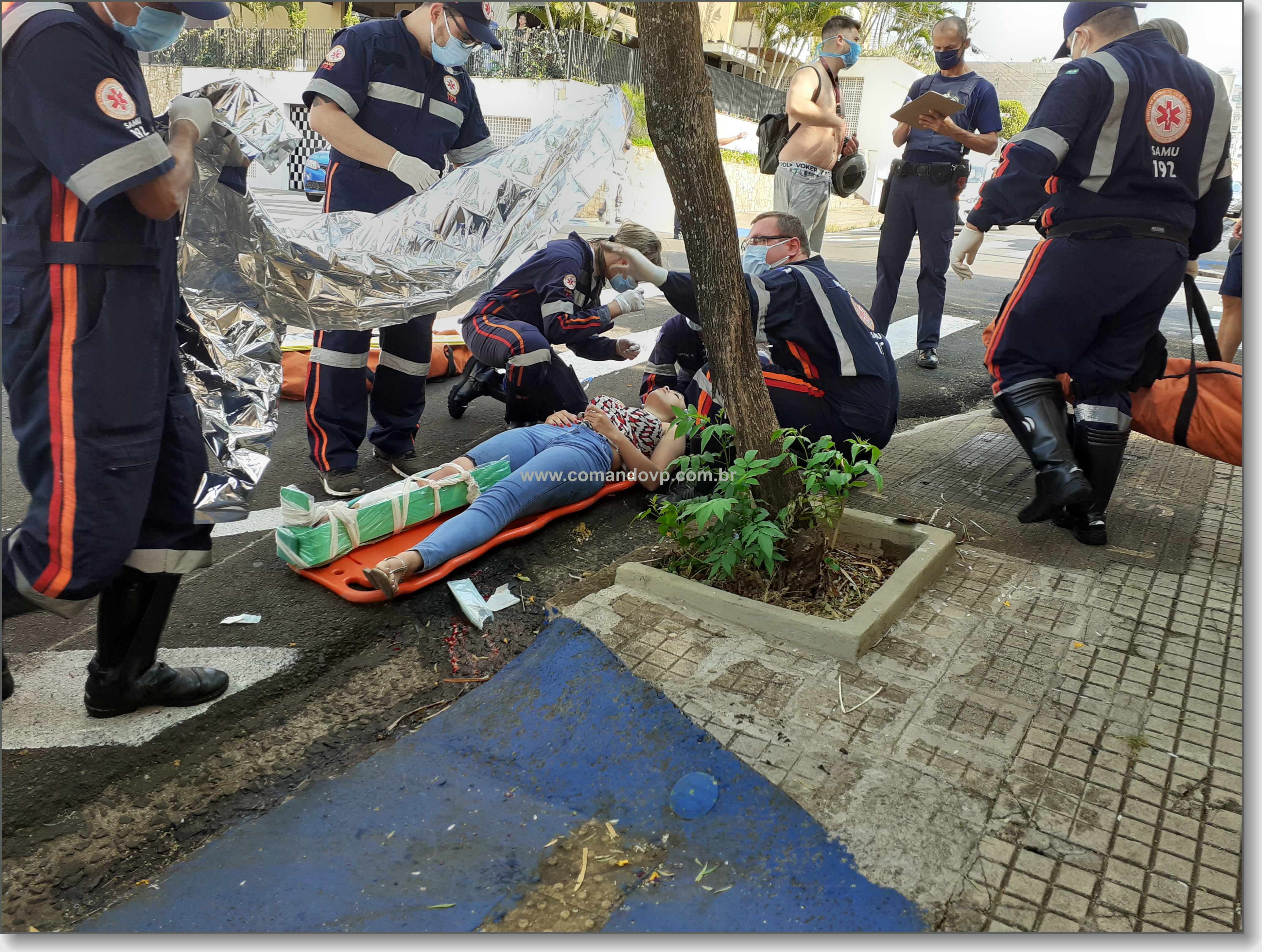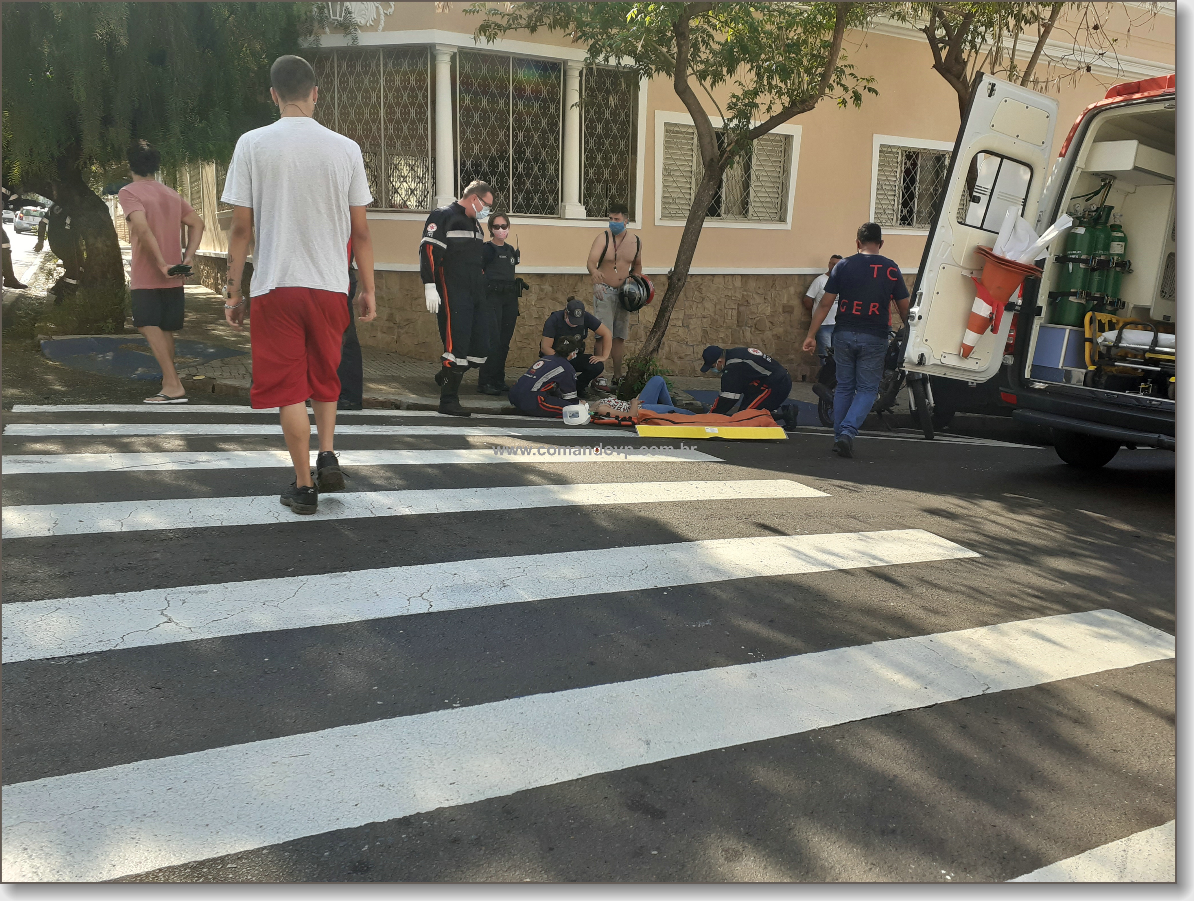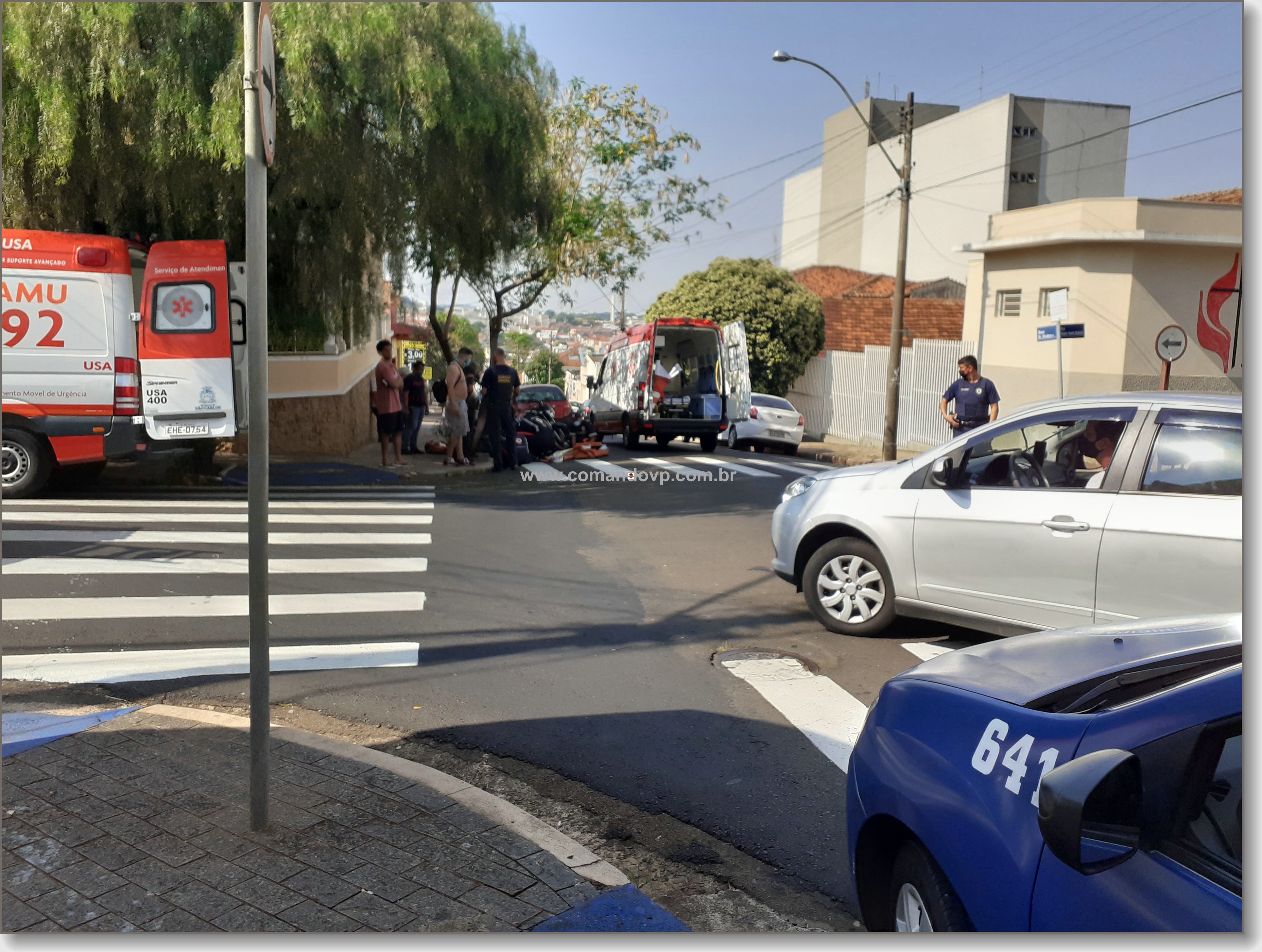 Com a colisão o casal foi lançado para frente e a jovem atingiu uma árvore. A Guarda Municipal passava pelo local e prestou os primeiros atendimentos. O SAMU foi acionado e duas ambulâncias estiveram presentes. Devido o ferimento grave que a jovem sofreu na perna direita, ela foi socorrida pela Unidade de Suporte Avançado ( USA) e encaminhada à Santa Casa. O condutor da moto aparentemente nada sofreu. O motorista do carro parou e também nada sofreu.