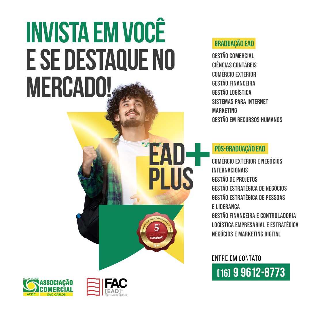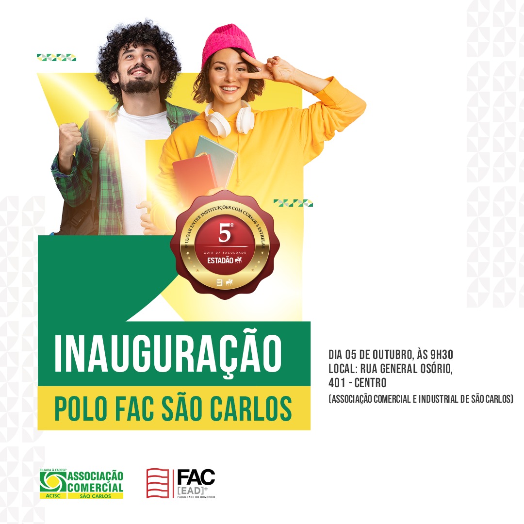 No dia 05 de outubro, às 9h30, acontecerá na ACISC (Associação Comercial e Industrial de São Carlos) a inauguração do Polo FAC São Carlos, a Faculdade do Comércio, sendo ela a faculdade oficial dos comerciantes e empresários. Desde sua abertura, há 2 anos já foram conquistados diversa unidades em 12 estados brasileiros, como Espírito Santo, Maranhão e Rio Grande do Sul, estando ativos todos os 110 polos atualmente.