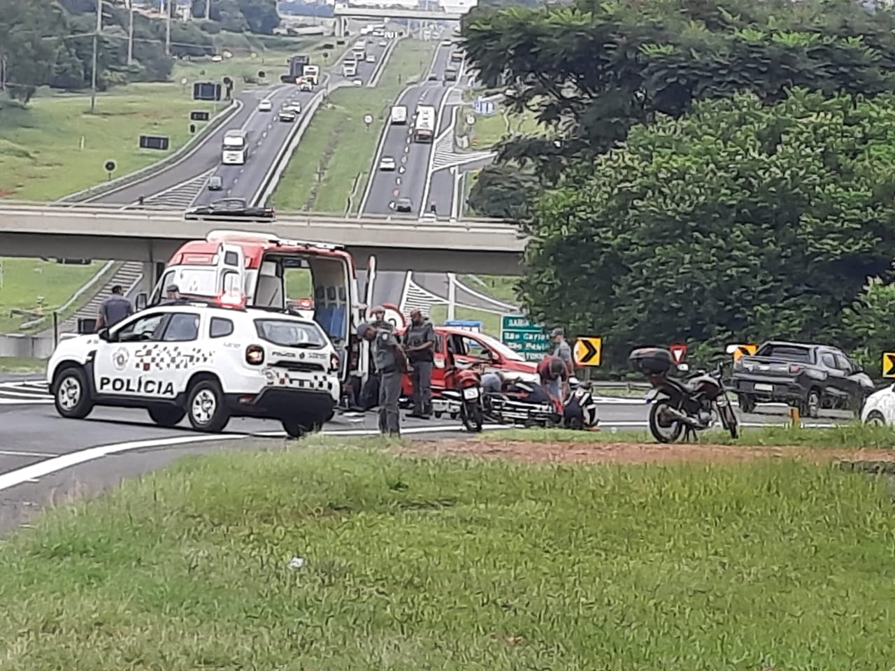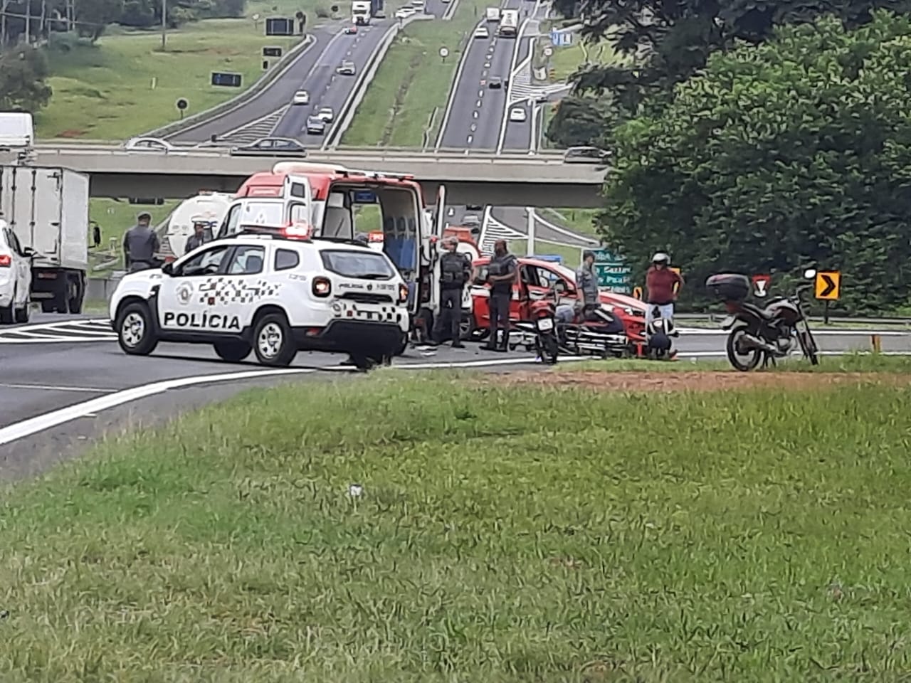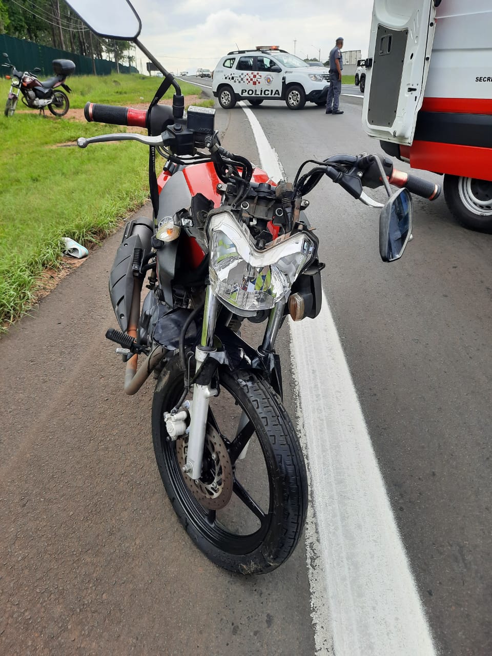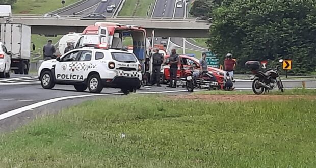 De acordo com informações, diversas viaturas da PM estavam acompanhando um carro, o qual estava em fuga, quando no km 235 + 200 metros, na alça de acesso da rodovia SP-318, uma mulher em uma moto vermelha, não teria visto a viatura e colidido. O SAMU e o Corpo de Bombeiros foram acionados e socorreram S.P.F, de 50 anos, foi socorrida para a Santa Casa.