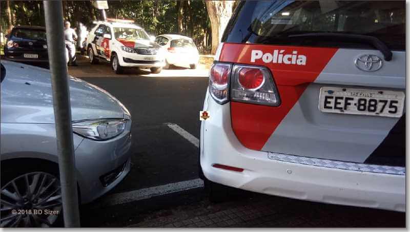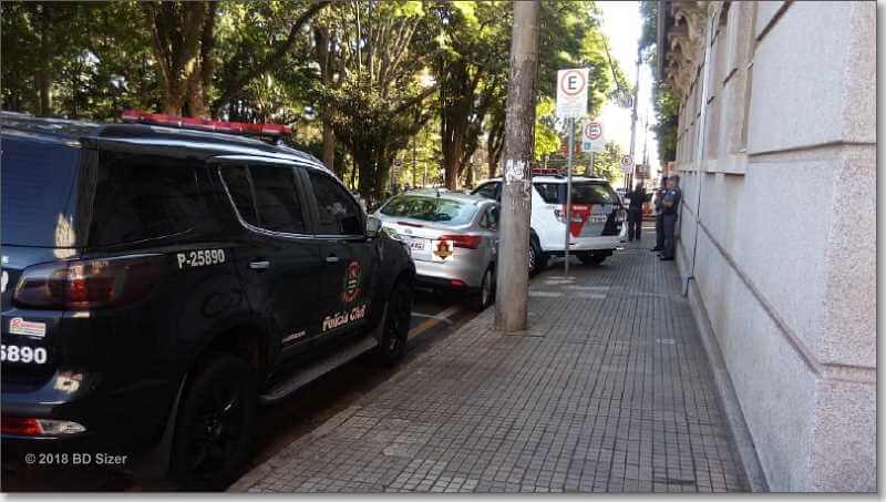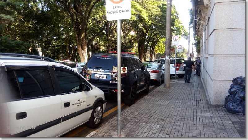 Um forte esquema de segurança foi montado nesta tarde de terça-feira, 22 de maio de 2018, defronte ao Fórum Criminal de São Carlos-SP, onde está ocorrendo audiência de instrução e julgamento de homens acusados de terem participados da morte de um policial militar no ano de 2012, nesta mesma Comarca.