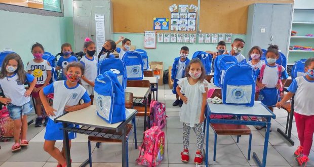 Cada aluno recebeu um kit contendo: uma mochila; um par de tênis [ou papete no caso das crianças matriculadas no Ensino Infantil]; duas camisetas; um short saia [para as meninas] e/ou um shorts [para os meninos].