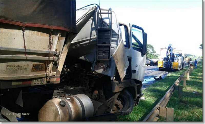 Um dos motoristas relatou que vinha de Poços de Caldas – MG, e acabou colidindo com o caminhão que vinha a frente. O caminhão que vinha atrás, com placas de Monte Alto – SP, estava em alta velocidade e acabou colidindo na traseira de seu veículo.
