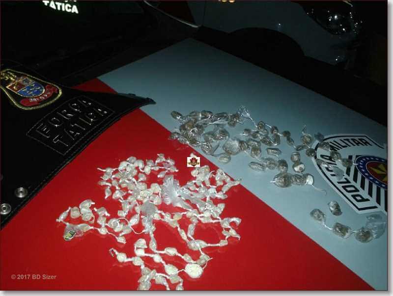 Segundo boletim de ocorrência, eram por volta das 18:00, viaturas da Força Tática foram averiguar uma denúncia de tráfico de drogas na referida rua. O denunciante passou o número da residência onde estaria ocorrendo o crime de tráfico, maconha, crack e cocaína. Um homem que estava nas proximidades foi abordado. Quando os policiais o averiguaram em seu bolso foram localizados 4 porções de maconha. Este disse ser apenas usuário e que havia acabado de comprar a droga. Os PMs foram para o local da denúncia e quando lá chegaram viram que na garagem estava um casal. A mulher ao perceber a presença dos policiais saiu correndo para o interior do imóvel e gritando para o filho fugir. Os policiais adentraram ao imóvel e evitaram que Júlio fugisse pela janela do seu quarto. No guarda roupa de Julio ( em cima) foram localizados 54 porções de maconha e 139 pedras de crack. A mãe ao ver o filho algemado partiu para cima dos PMs e agrediu um dos policiais. A mulher proferiu palavras de baixo calão contra os PMs que a detiveram também. Ela foi encaminhada ao médico e o filho Júlio Cesar Santos Dias, de 19 anos, conduzido ao Plantão Policial, autuado em flagrante por tráfico de drogas e recolhido ao Centro de Triagem de São Carlos. O usuário foi qualificado e liberado.