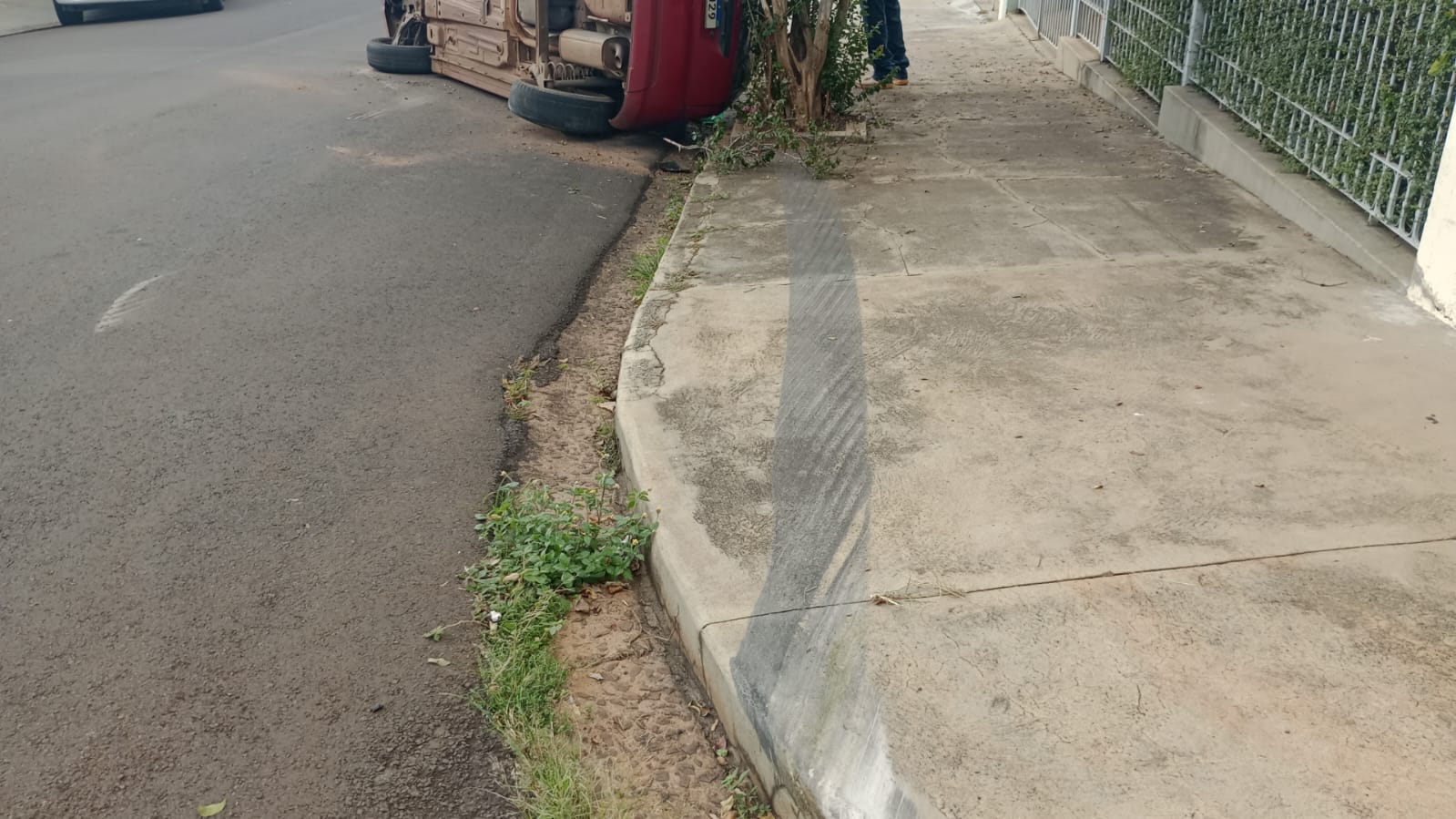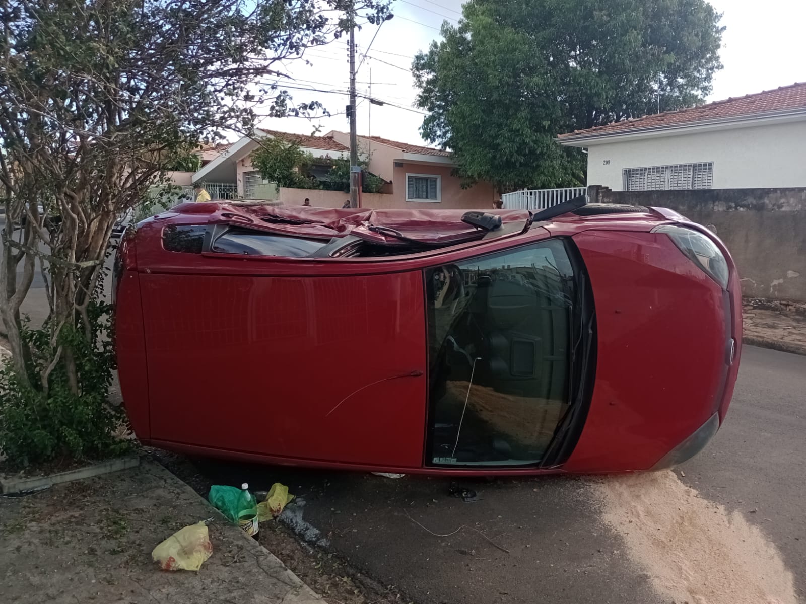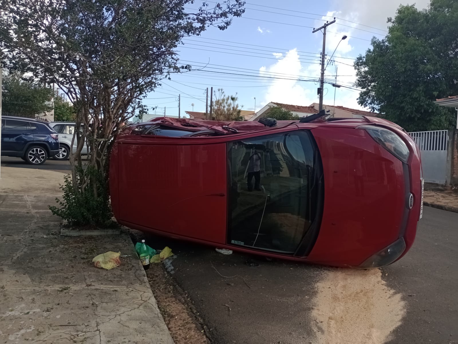 Um veículo Ford Fiesta da cor vermelha, capotou  nesta tarde de quarta-feira,  30/03/2023, na Rua Rafael de Abreu Sampaio Vidal,  São Carlos-SP.