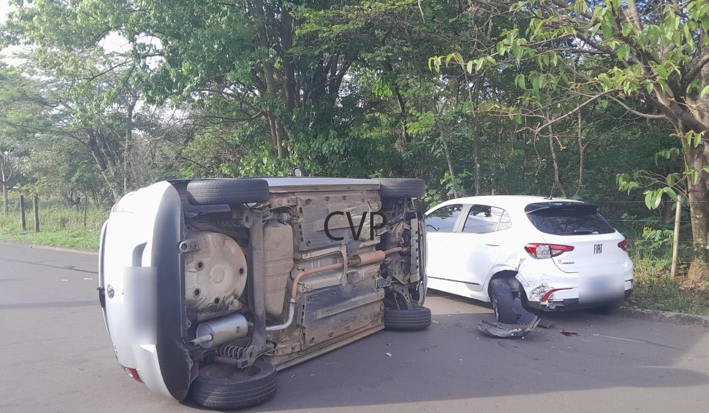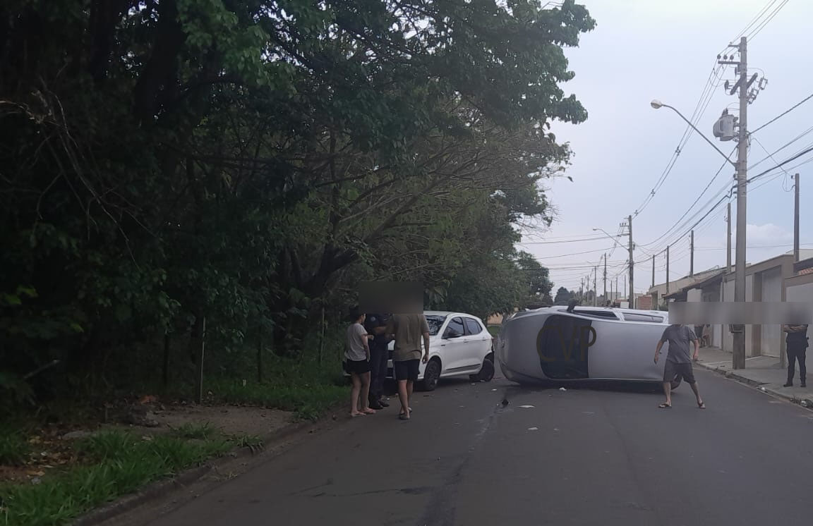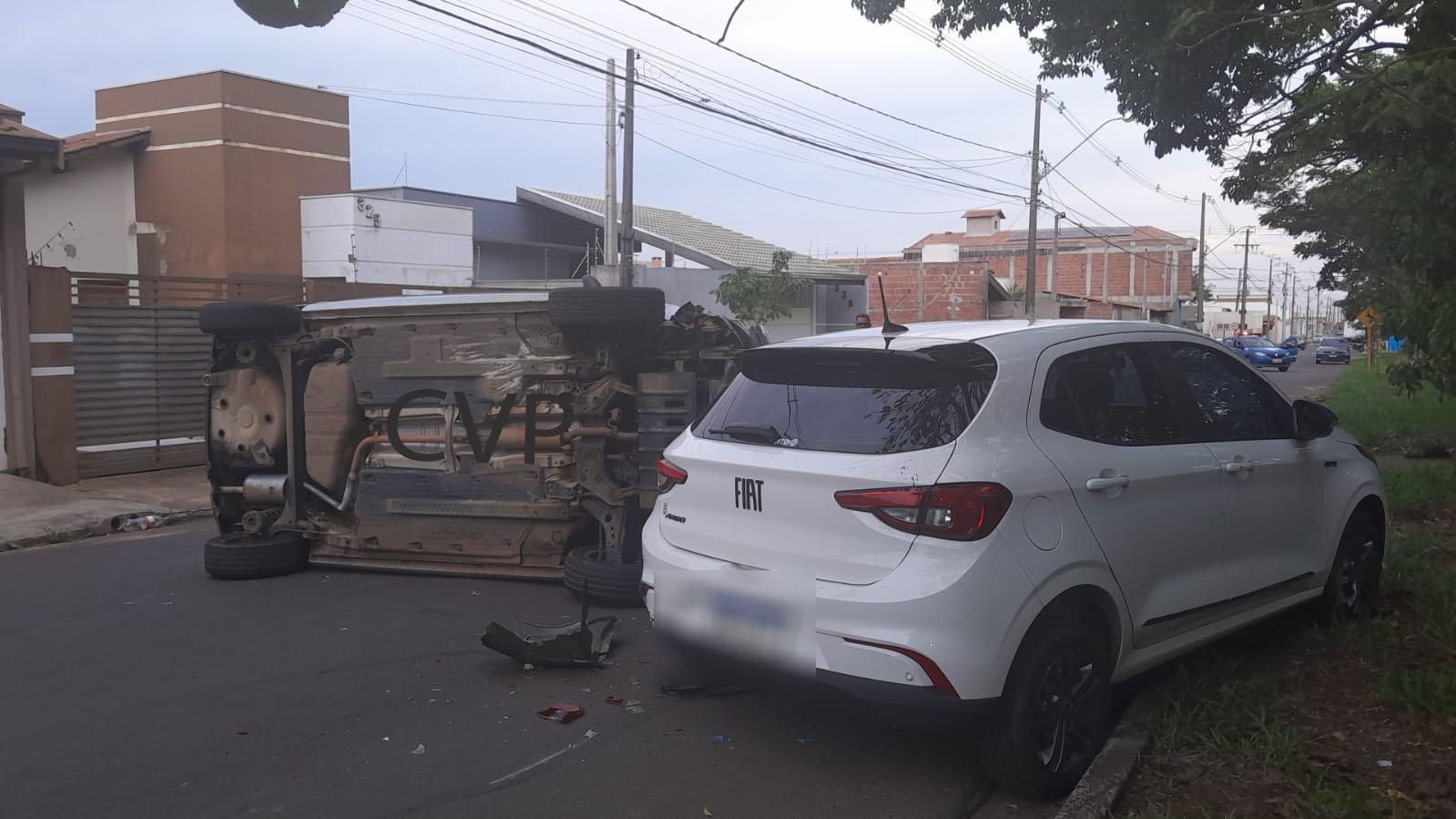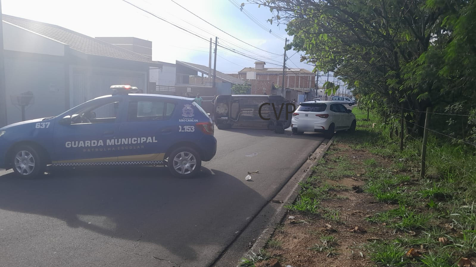 Um veículo Fox tombou nesta tarde de domingo, 8 de outubro de 2023, após colidir em um veículo Argo na Rua Fortunato Dovigo, bairro Jardim Embaré, São Carlos-SP.