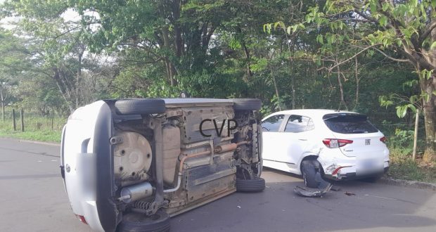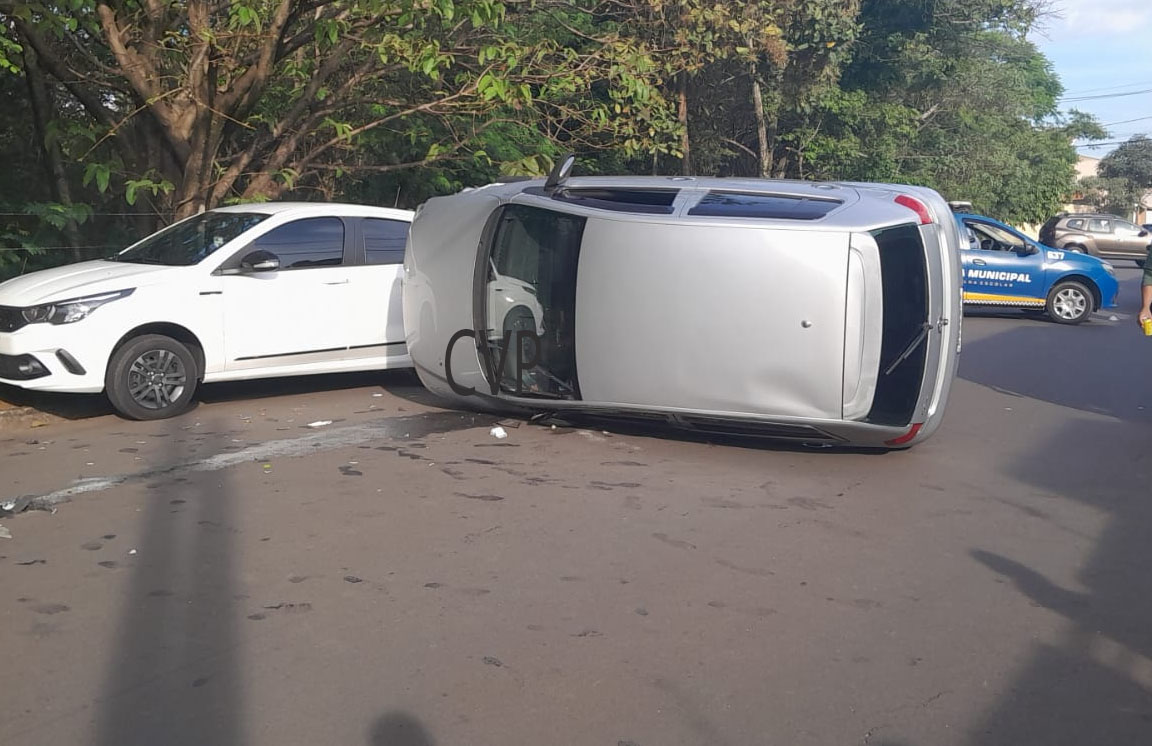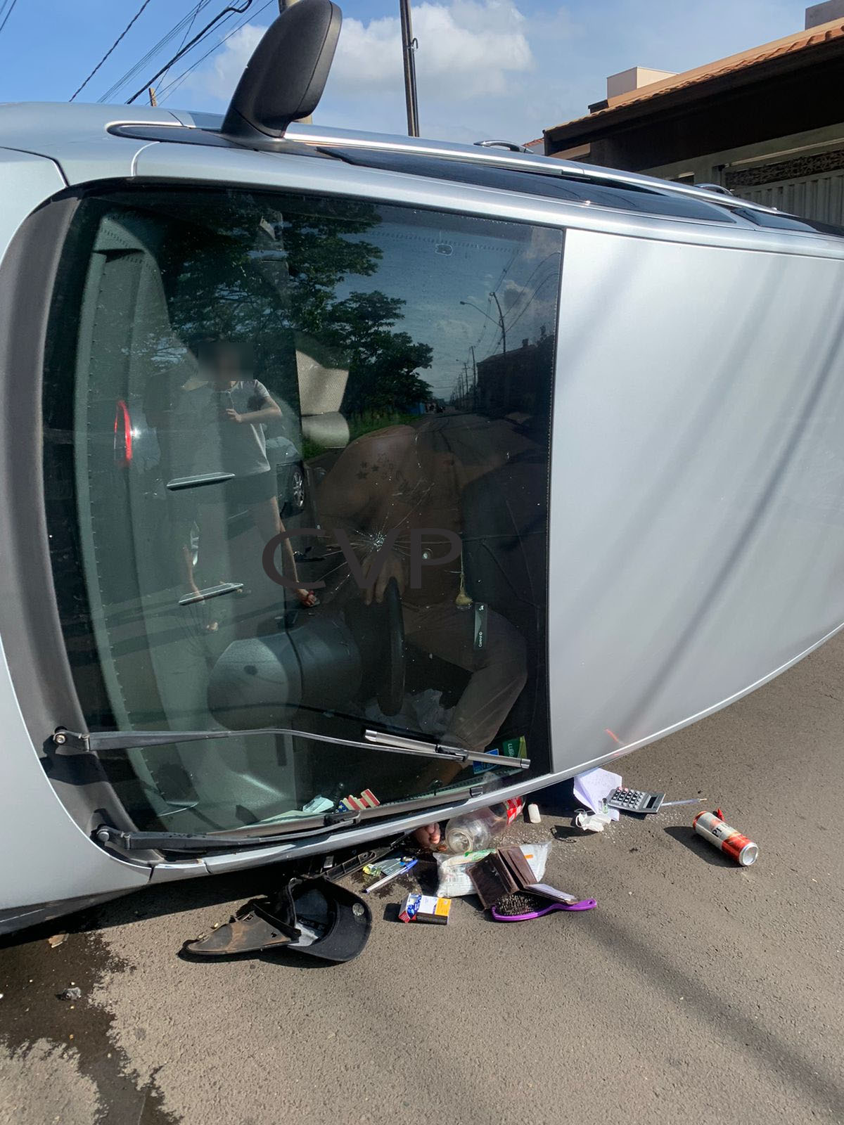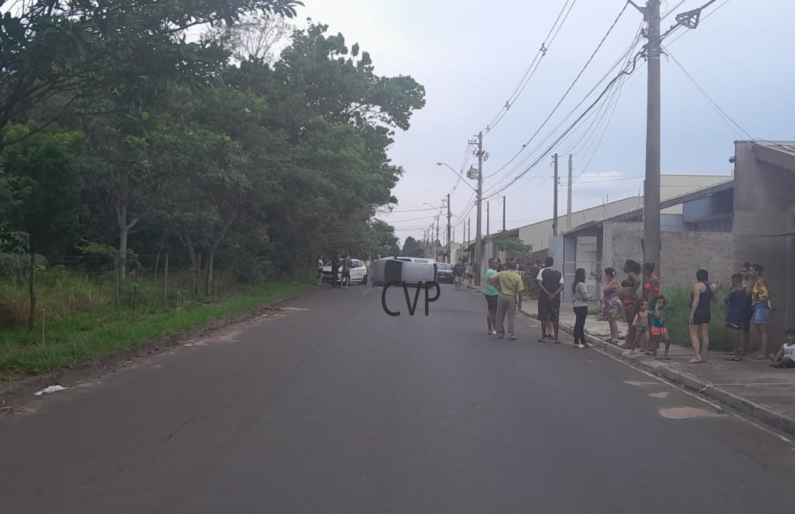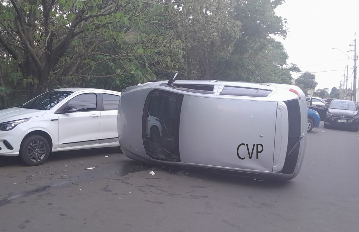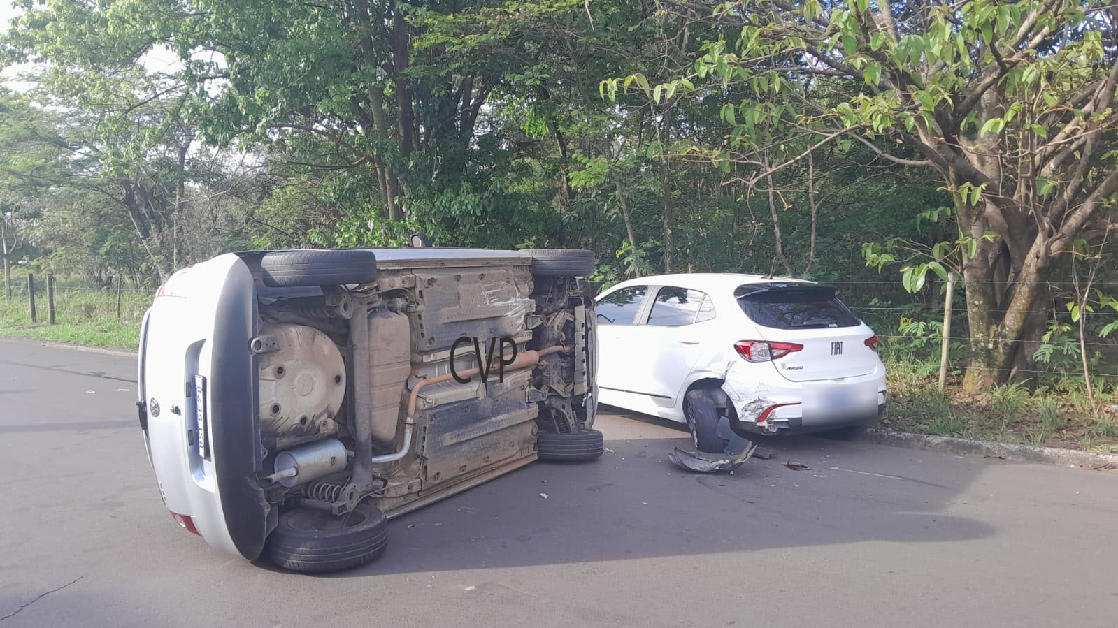 Um veículo Fox tombou nesta tarde de domingo, 8 de outubro de 2023, após colidir em um veículo Argo na Rua Fortunato Dovigo, bairro Jardim Embaré, São Carlos-SP.