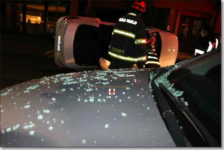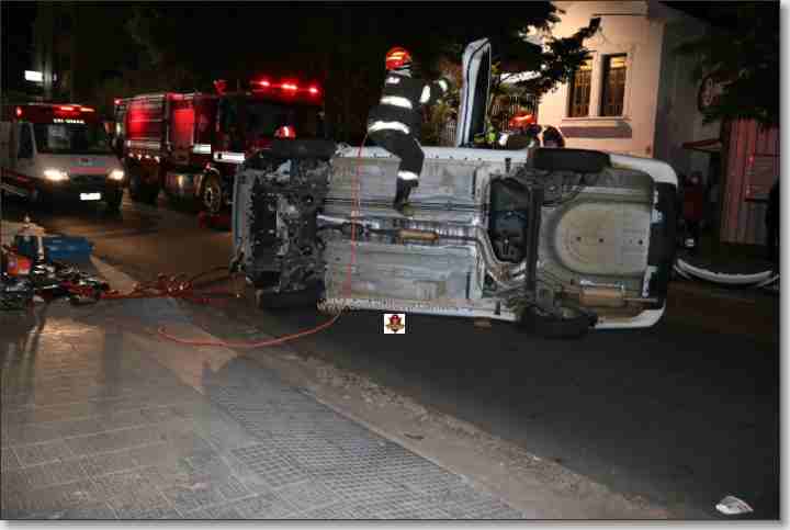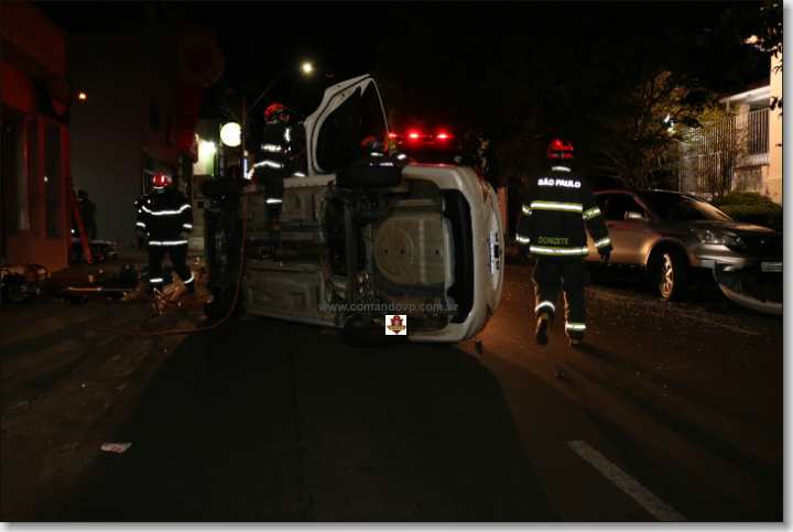 Um veículo Nissan Versa tombou nesta madrugada de domingo, 14 de agosto de 2022, após colidir em outros dois carros estacionados na Rua Dr. Carlos Botelho, região central de São Carlos-SP.