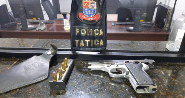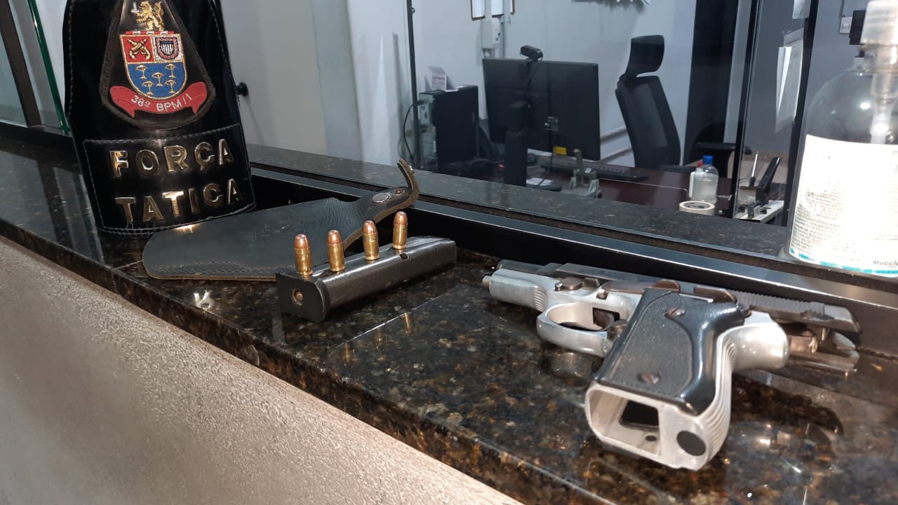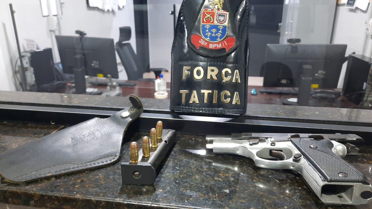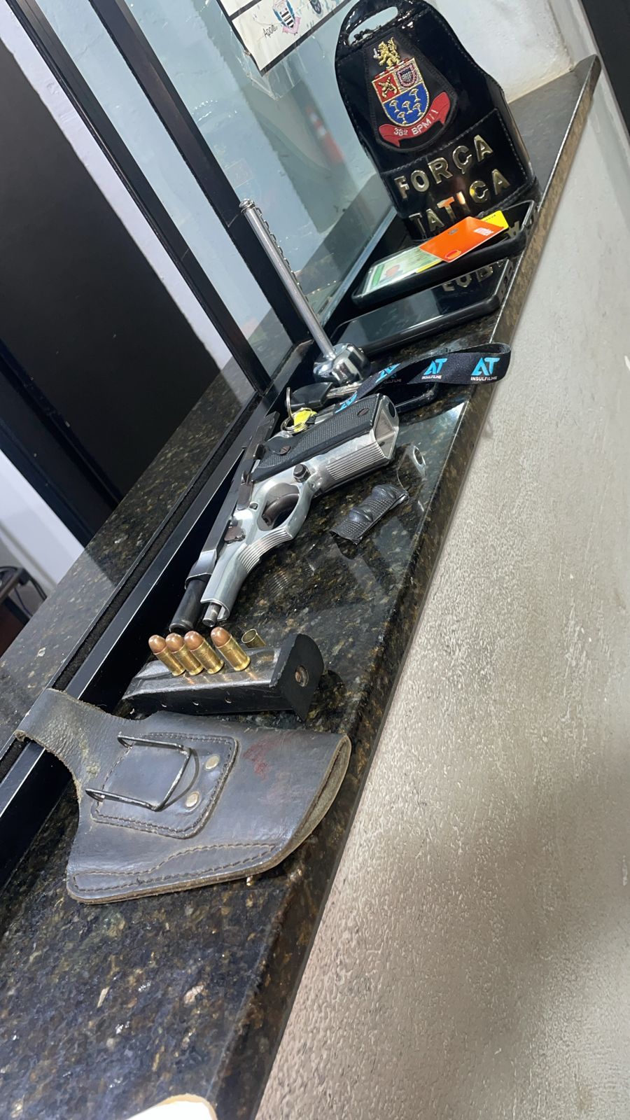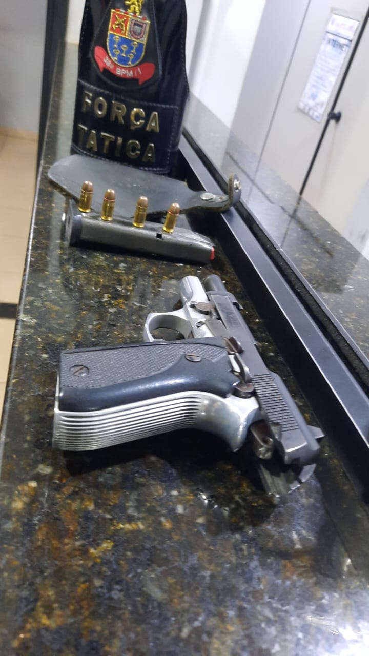 De acordo com informações, a PM foi comunicada através do 190, que um indivíduo teria efetuado disparos de arma de fogo, com intuito de intimidar uma mulher, a qual estava no comércio da mãe. Os policiais da Força Tática foram informados pela mulher, a qual disse ter Medida Protetiva contra o ex-marido, e que ele teria ido ao estabelecimento comercial da mãe dela e o amigo, teria sacado de uma pistola e efetuado os disparos para o alto. Depois teriam fugido em um Golf da cor verde.