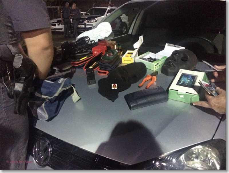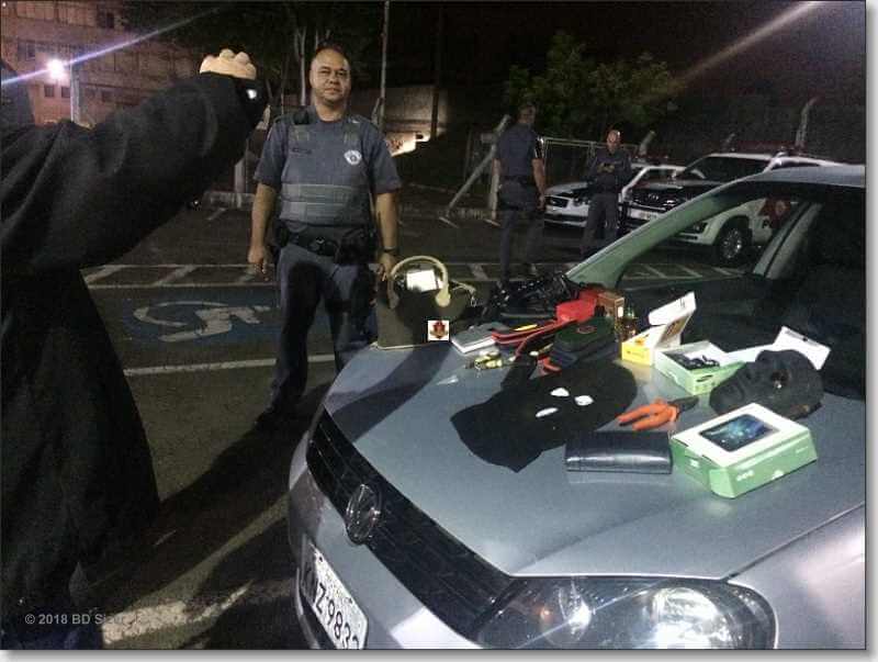 Segundo informações, a vítima, um senhor de 79 anos, foi rendida na sua casa na rua Marechal Deodoro e com uma arma na cabeça foi obrigada ficar calada e entregar tudo de valor que tinha. Ainda de acordo com o idoso, três pessoas, sendo uma mulher e dois indivíduos do sexo masculino, o renderam, colocaram a mão na sua boca e um revólver na sua cabeça e mediante graves ameaças de morte, eles roubaram joias, relógios, entre outros objetos de valor e fugiram em um carro. A PM foi acionada e em patrulhamento conseguiu avistar o carro na região do Jd. Botafogo. Ainda de acordo com a PM, D. S, de 33 anos, era a condutora do veículo e tinha como passageiro M. S. L, de 33 anos. No carro foram localizados vários objetos. A mulher disse que era taxista e que os objetos eram do passageiro. O mesmo negou ser dono dos produtos. Os policiais descobriam que o carro era furtado. A condutora D. S, disse que havia comprado o mesmo, mas disse desconhecer que era produto de crime. A mulher relatou que havia apanhado o tal passageiro em uma casa no bairro Planalto Verde e o levado até a Praça Industrial no bairro Vila Nery onde ele teria saído com F. C. N. N, de 32 anos e uma mulher e retornado com o objetos (mascara, perfumes entre outros). M.S.L, negou mais uma vez ser dono dos objetos e disse ainda ser namorado de D. S. O casal foi abordado pelo sargento Marcos e soldado William. Foi pedido apoio de demais viaturas e na rua Almir Soares Quatrochi, foi localizado um veículo Palio na garagem e no interior estavam G, J, F e F, sendo que este disse ser motorista de Uber em São Paulo e teria vindo para São Carlos trazer os clientes inclusive Moises, o qual havia sido detido no carro com D. Na casa foram localizados perfumes, relógios e também maçarico, que segundo a PM, seria usado na pratica furto a caixas eletrônicos. Ainda de acordo com a Polícia Militar, os homens de São Paulo confessaram que iriam ficar em São Carlos três dias para pratica de furto a caixas eletrônicos. Na casa também foi localizado o RG de M, o mesmo que havia sido detido no carro dirigido por D. Todos foram encaminhados ao Plantão Policial onde a vítima reconheceu apena D, como sendo a mulher que junto com outros comparsas teria praticado o roubo em sua casa. D.S, de 33 anos, F.G.S,K, 27, F.C.N.N,32, G. F. S.R,36 e J.S,30, todos foram conduzidos ao Plantão Policial, a mulher foi autuada em flagrante por roubo, formação de quadrilha e receptação e recolhida a ala feminina do Centro de Triagem de São Carlos. Os homens também foram autuados em flagrante e recolhidos a ala masculina do Centro de Triagem de São Carlos, porém todos deverão passar por audiência de custódia nesta quinta-feira, caso permaneçam presos, serão encaminhados algum presídio da região. O carro produto de furto foi recolhido ao Pátio Municipal. Os produtos roubados da casa do idoso foram devolvidos, mas têm alguns objetos que não foram reconhecidos pelo idoso e foram apreendidos pela PC.