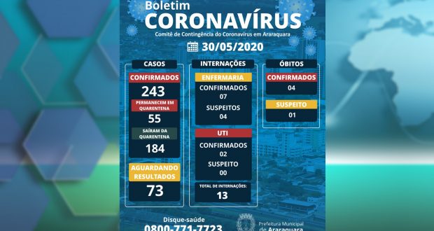 O Comitê de Contingência do Coronavírus, de Araraquara, confirmou na manhã deste sábado, dia 30, mais 09 casos da COVID-19. Agora são 243 confirmados da doença do novo coronavírus.