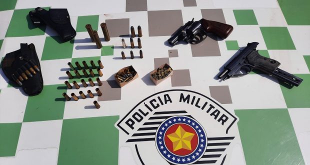 No local, a equipe localizou um revólver calibre 38 e uma pistola calibre 22.