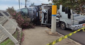 Um acidente inusitado chamou a atenção de quem passava pela Rua Castro Alves (Rua 16), no início da tarde desta quarta-feira (19). A plataforma de um caminhão guincho, que carregava dois veículos, sendo um FIAT/Uno e um HYUNDAI/HB20, acabou tombando na via, bem na lateral de um supermercado Atacadista. O alambrado do estabelecimento, assim como uma árvore do calçamento, ajudaram ...