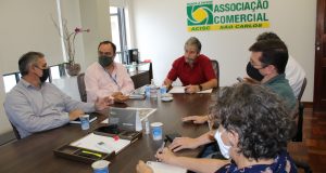 O presidente da ACISC (Associação Comercial e Industrial de São Carlos), José Fernando Domingues, o Zelão, juntamente com os diretores, Mozart Pedroso, Renato Batista e Lídia Maria Mendes, e o gerente executivo, Alexandre Rosa, se reuniram com os secretários municipais de Transporte e Trânsito, Obras Públicas, e Habitação e Desenvolvimento Urbano, Paulo Sérgio Luciano, João Muller e Wilson Jorge Marques, ...