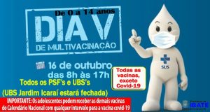 A Secretaria Municipal da Saúde de Ibaté, por meio da Vigilância Epidemiológica, realiza neste sábado, dia 16 de outubro o “Dia V” da Campanha de Multivacinação 2021. Estarão disponíveis todas as vacinas do calendário básico de vacinação para crianças a partir de zero a 14 anos, 11 meses e 29 dias. Neste sábado, durante a Campanha de Multivacinação em Ibaté ...