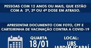 Em virtude do número de faltosos, a Secretaria Municipal de Saúde de Ibaté, por meio da Vigilância Epidemiológica, disponibiliza mais um Plantão Noturno de Vacinação contra a Covid-19, nesta quarta-feira (18), exclusivamente, na Unidade Básica de Saúde (UBS) Jardim Icaraí, das 17h às 21h. A imunização contra a Covid-19 é direcionada às pessoas com 12 anos ou mais, que estão ...