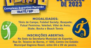 Inscrições serão realizadas de 04 a 09 de janeiro, na sede da Secretaria A Prefeitura de Ibaté, através da Secretaria Municipal de Esportes, Turismo e Lazer, inicia o novo ano com a realização do Festival de Verão, que acontecerá no Complexo Esportivo Parellão, no bairro Popular. O evento esportivo reunirá várias competições e modalidades diversas, durante todo o mês de ...