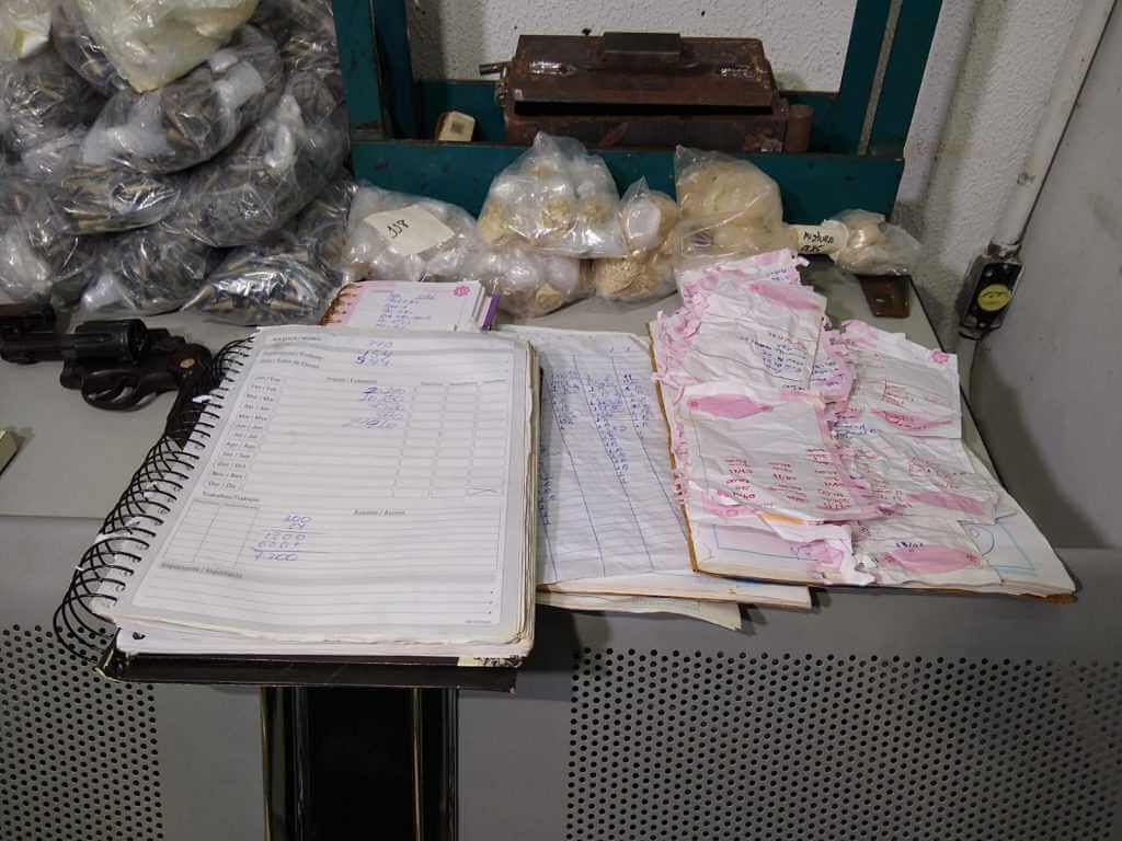 No local foram apreendidos, aproximadamente 12 quilos de cocaína – distribuídos em eppendorf’s e a granel, porções de crack e maconha, ecstasy, LSD, uma prensa industrial, (05) cinco rádios comunicadores “usados pelos traficantes para indicar que a Polícia ta chegando nas proximidades”, (05) cinco balanças de precisão, uma espingarda calibre 12 com seis munições intactas, uma pistola 9 mm com a numeração suprimida com várias munições, um revólver calibre 38 com a numeração raspada com quatro munições, (01) uma munição calibre 44, anotações do tráfico de drogas, 14 litros de éter e acetona “usados no preparo da cocaína e vários apetrechos “liquidificadores, facas e rolos de plástico filme – usados no refino e preparo do entorpecente.