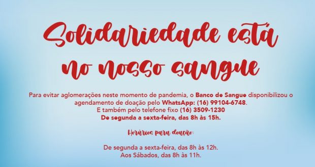 Devido à pandemia da COVID-19, desde março, o Banco de Sangue tem seguido as regras da Associação Brasileira de Hematologia. Foi proibida a entrada de acompanhantes e as doações estão sendo agendadas para evitar aglomerações. Dessa maneira, é possível garantir a proteção de todos e regular o fluxo de doadores.