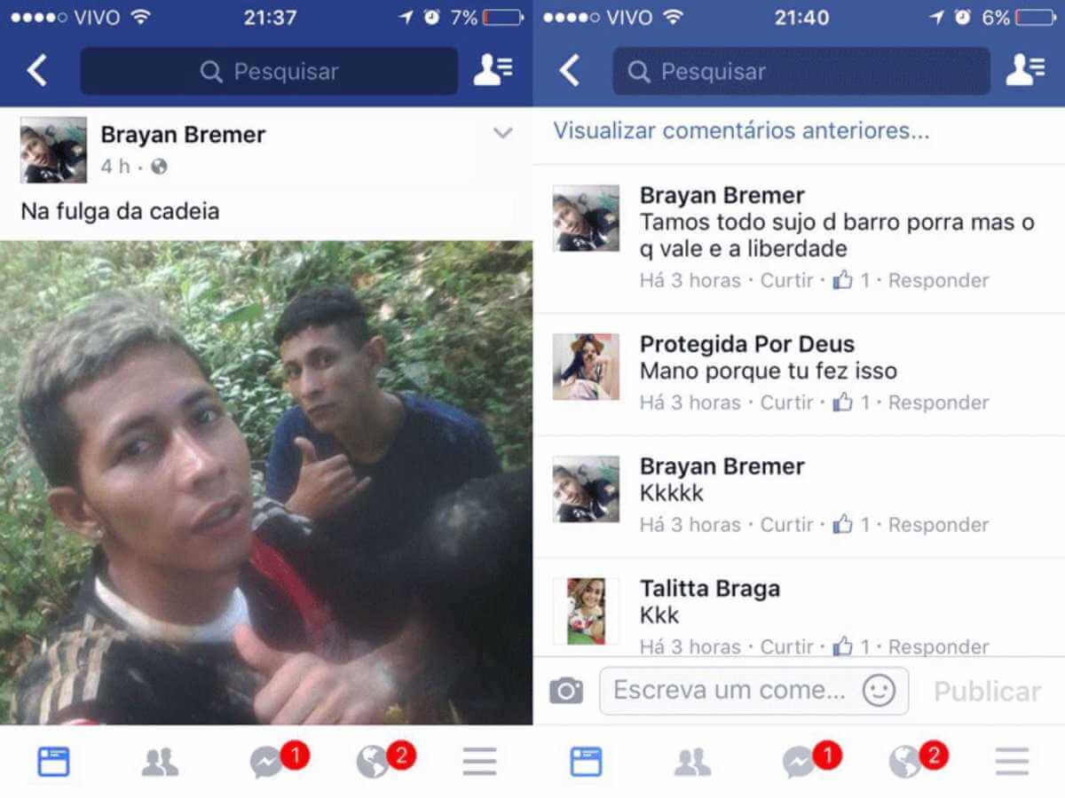 Um fugitivo de um dos presídios de Manaus virou memes na Internet após postar uma foto no Facebook logo após a fuga. Com a descrição ‘Na fuga (sic.) da cadeia’, Brayan Bremer Quintelo Mota aparece na foto com o amigo em um matagal onde estavam escondidos.