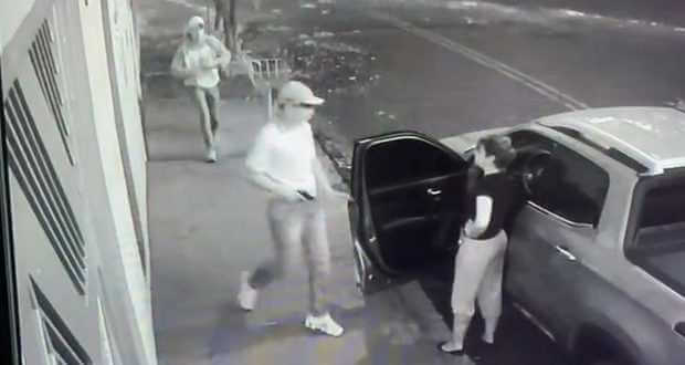 Através de imagens das câmeras de monitoramento é possível ver a ação dos bandidos. A mulher está do lado de fora do veículo conversando com um morador da residência, momento em que a dupla se aproxima. Um dos bandidos saca uma arma, que estava escondida na cintura e rende a mulher. O outro tenta cobrir o rosto e ameaça o morador.
