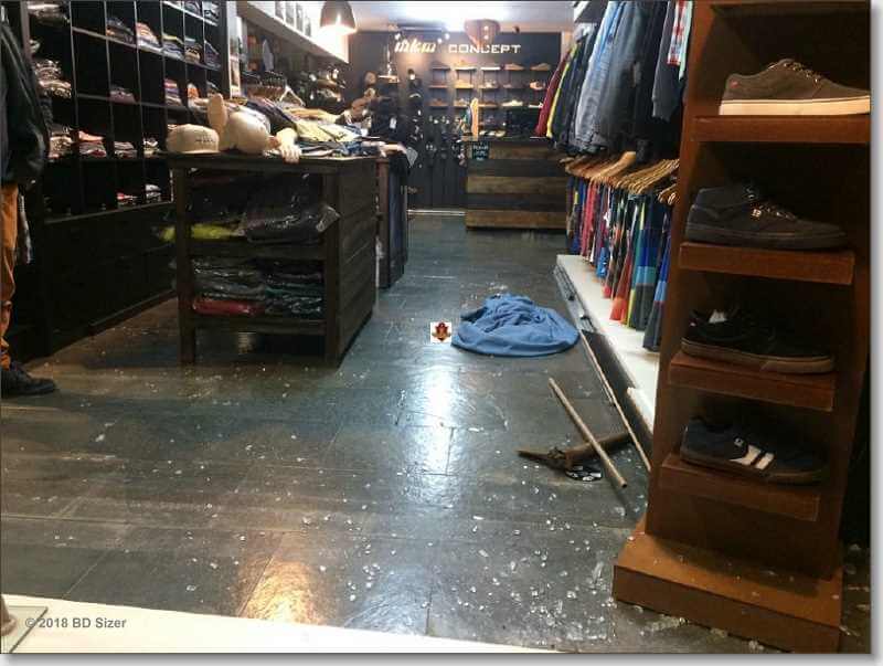 Por volta das 3:15 a PM foi acionada para o local devido indivíduos não identificados terem estourada a vidraça com uma machadinha. Os ladrões cerca de três pararam o carro na rua Nove de Julho e revezaram no momento do furto. Segundo informações de uma testemunha que mora próximo ao local , era um veículo na cor preta. O sistema de monitoramento da loja chegou após o alarme disparar.
