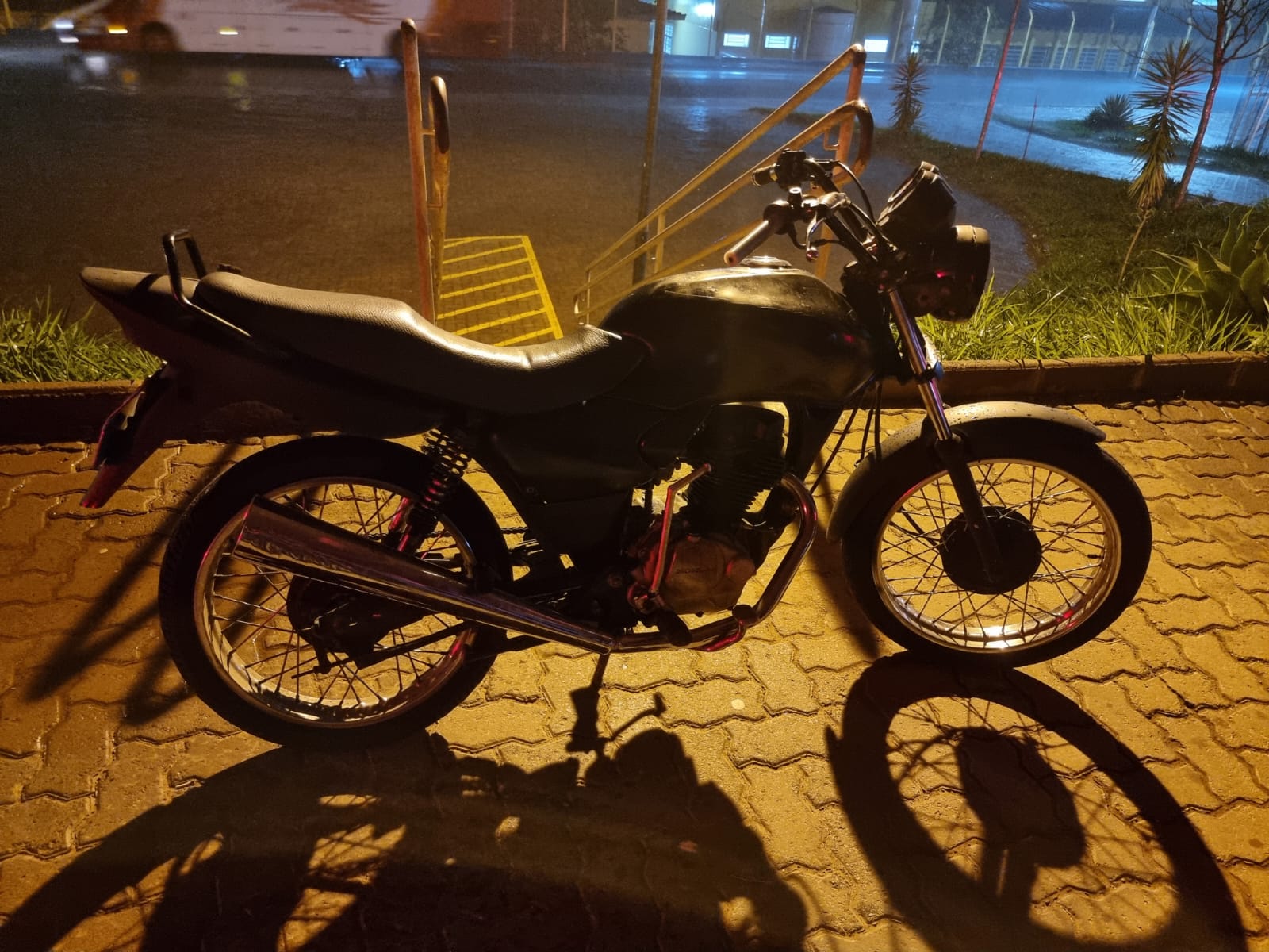De acordo uma equipe estava em patrulhamento preventivo, momento que flagrou uma moto ocupada por dois indivíduos. Eles empreenderam fuga, depois abandonaram a moto e fugiram para dentro de uma mata. A moto estava com queixa de furto, crime este ocorrido no dia 06-10. A moto foi encaminhada para a Central de Polícia Judiciária, onde ficou à disposição da vítima.