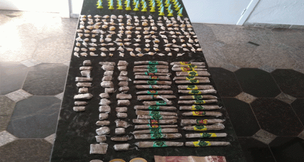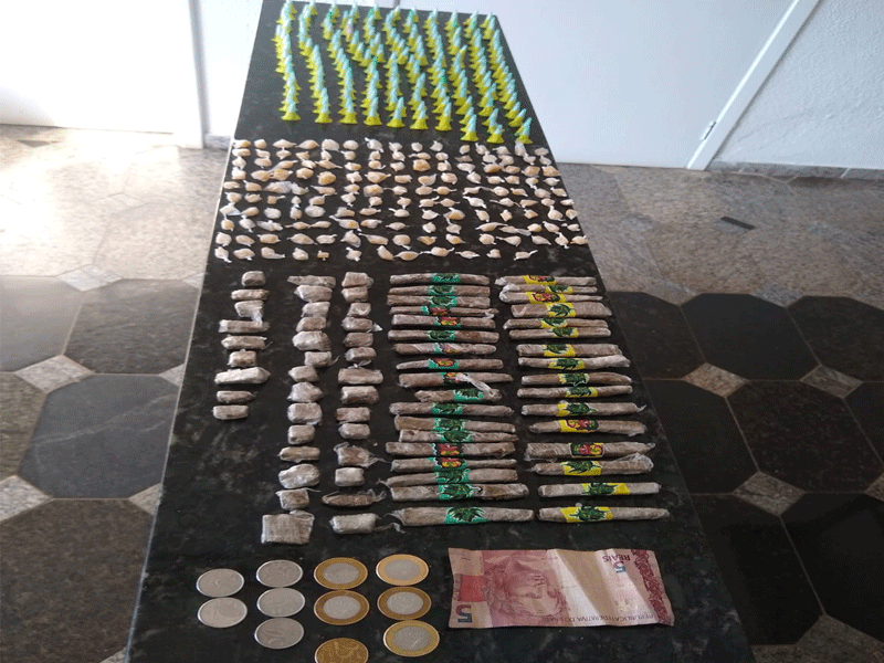 De acordo com informações, a Polícia Militar estava em patrulhamento quando escutou um sujeito gritando “moiou”. Vários indivíduos saíram correndo e deixaram para trás , 181 pinos de cocaína, 147 pedras de crack, 34 porções de maconha , 37 buchas de maconha e R$ 12,75.