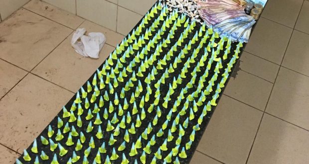 Segundo informações, uma viatura da PM estava em patrulhamento pelo local dos fatos visualizou dois indivíduos que ao notarem a presença dos policiais saíram correndo, sendo um deles abordado e em seguida o outro entrou em uma residência arremessando um saco que segurava nas mãos. Com o primeiro individuo foram localizados 24 pinos de cocaína e com o apoio do Comando de Força Patrulha foi localizada uma sacola com mais drogas.