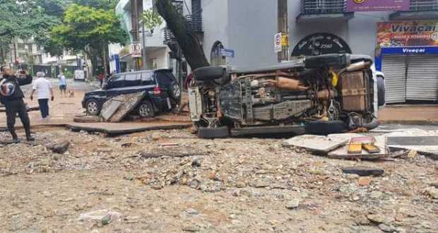 A força da água arrombou portas de aço e quebrou vidraças. Carros foram arrastados e ficaram virados com as rodas para cima.