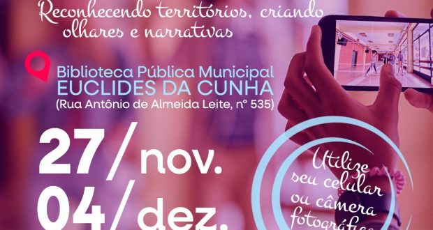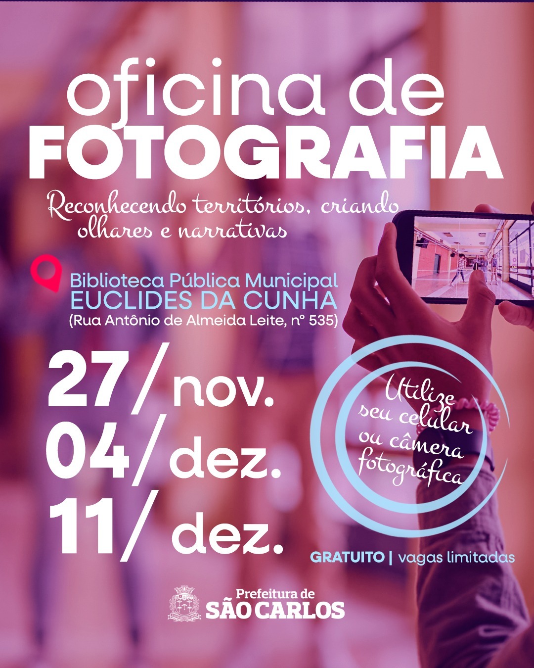 O Sistema de Bibliotecas de São Carlos (SIBISC) da Secretaria Municipal de educação (SME), vai realizar nos dias (27/11), 04 e 11 de dezembro, na Biblioteca Pública Municipal “Euclides da Cunha”, localizada na rua Antonio de Almeida Leite, nº 535, na Vila Prado, a Oficina de Fotografia “Reconhecendo territórios, criando olhares e narrativas”.