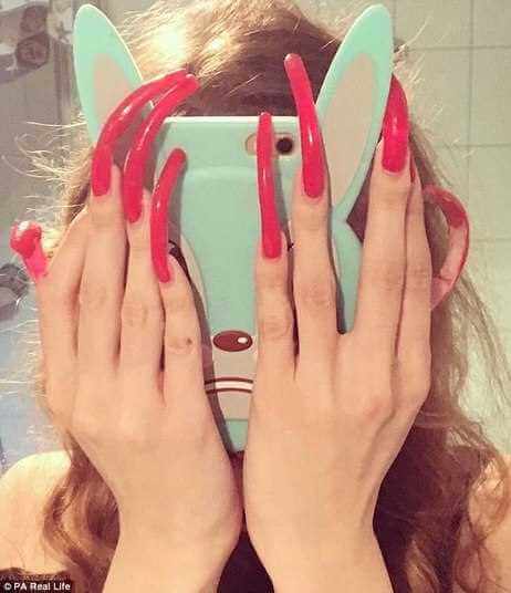 Simone Taylor, 16 anos, que mora em Nuremberg, na Alemanha, não corta as suas unhas há três anos e por esse motivo teve que reaprender até mesmo a fazer tarefas diárias básicas. Atualmente, suas unhas estão medindo 14,8 (polegar) a 12 centímetros (demais dedos) e estão dificultando a vida da adolescente.