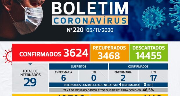 Dos 3.624 casos positivos, 3.347 pessoas apresentaram síndrome gripal e não foram internadas, 3 óbitos sem internação, 274 pessoas precisaram de internação devido a COVID-19, 209 receberam alta hospitalar e 51 positivos internados foram a óbito. 3.468 pessoas já se recuperaram totalmente da doença. 14.455 casos suspeitos já foram descartados para o novo coronavírus (80 resultados negativos foram liberados hoje).