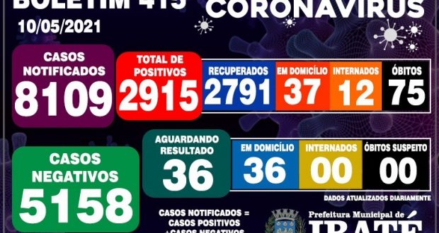 Hospital de Ibaté e transferida para hospital de referência de São Carlos, vindo a óbito nesta segunda-feira, 10 de maio. No sábado, dia 08 de maio, a cidade também registrou o óbito de um homem de 61 anos, com histórico de comorbidade, que testou positivo no dia 19 de abril e estava internado em hospital particular na cidade de Araraquara, vindo a óbito naquele dia. Ibaté registra 2.915 casos positivos (sendo 2.791 recuperados; 37 casos em isolamento domiciliar; 12 pacientes em internação e 75 óbitos); 5.158 resultados de exames negativos; 36 pacientes aguardando resultados (todos em isolamento domiciliar). A Secretaria Municipal da Saúde ressalta que trabalha seguindo todos os protocolos de atendimento e segurança do Ministério da Saúde, e reforça o pedido para que todos continuem respeitando as medidas e protocolos sanitários. O isolamento social é a melhor forma de prevenir a disseminação do Coronavírus.