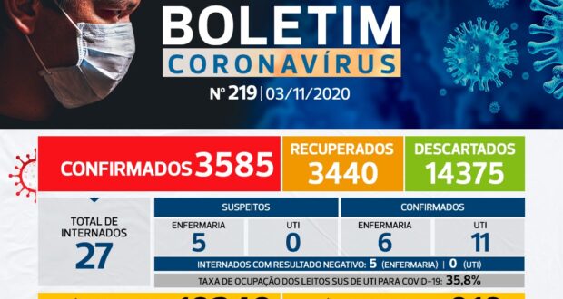Dos 3.585 casos positivos, 3.317 pessoas apresentaram síndrome gripal e não foram internadas, 3 óbitos sem internação, 265 pessoas precisaram de internação devido a COVID-19, 201 receberam alta hospitalar e 51 positivos internados foram a óbito. 3.440 pessoas já se recuperaram totalmente da doença. 14.375 casos suspeitos já foram descartados para o novo coronavírus (05 resultados negativos foram liberados hoje).