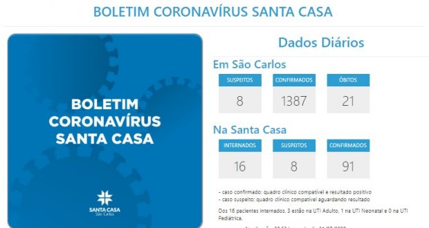 A Santa Casa informa, nesta *sexta-feira (31/7)*, que o número de casos confirmados subiu de *89* para *91*. Trata-se de 1 mulher, 81 anos, de São Carlos, internada nesta sexta-feira (31/7) e 1 mulher, 89 anos, de São Carlos, internada nesta sexta-feira (31/7), as duas já diagnosticadas com COVID-19.