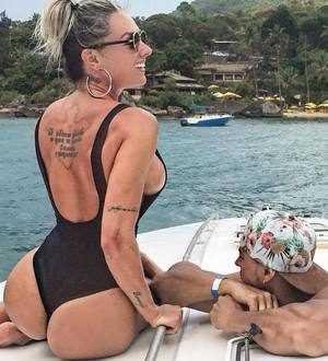 Na imagem, eles aparecem em um barco e o destaque fica com o corpão da musa, especialmente seu bumbum.