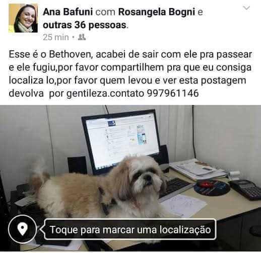 Uma família está a procura de seu cachorrinho que fugiu da rua Raimundo Correa em São Carlos. Por favor, caso veja o pequeno e querido animalzinho, entrar em contato com a sua dona pelo telefone que aparece na foto. Respeite este momento e não passe trote, por favor.