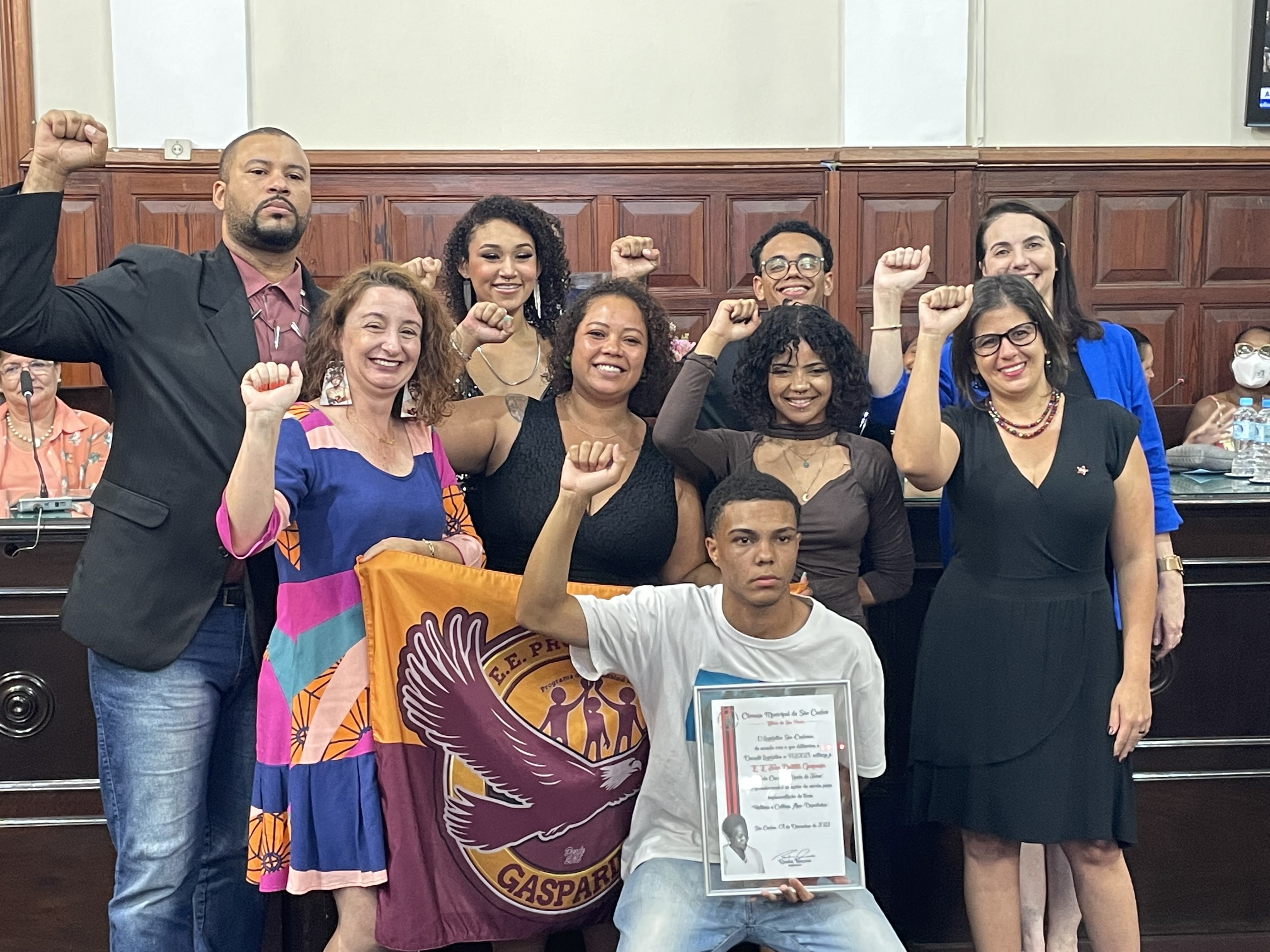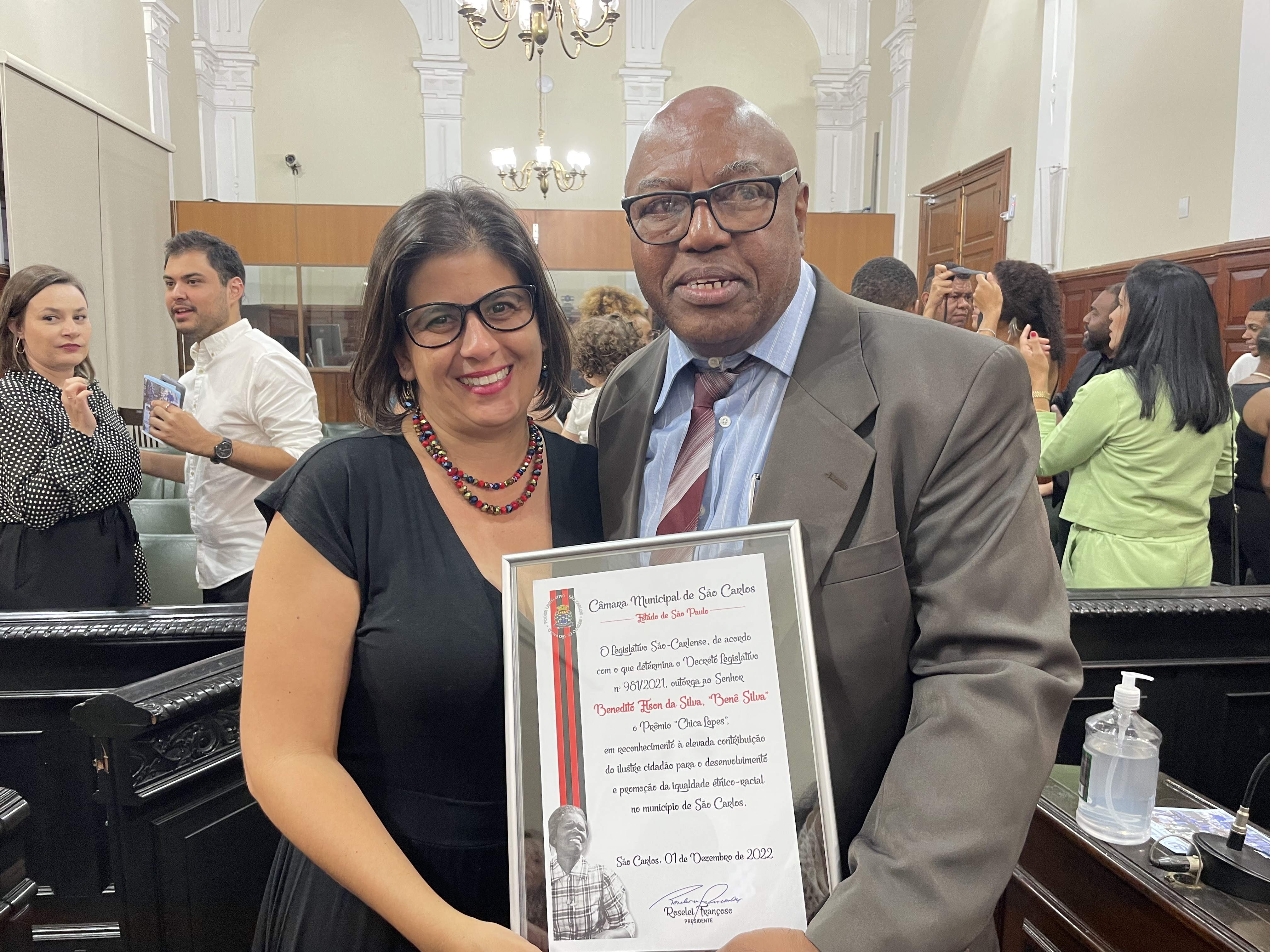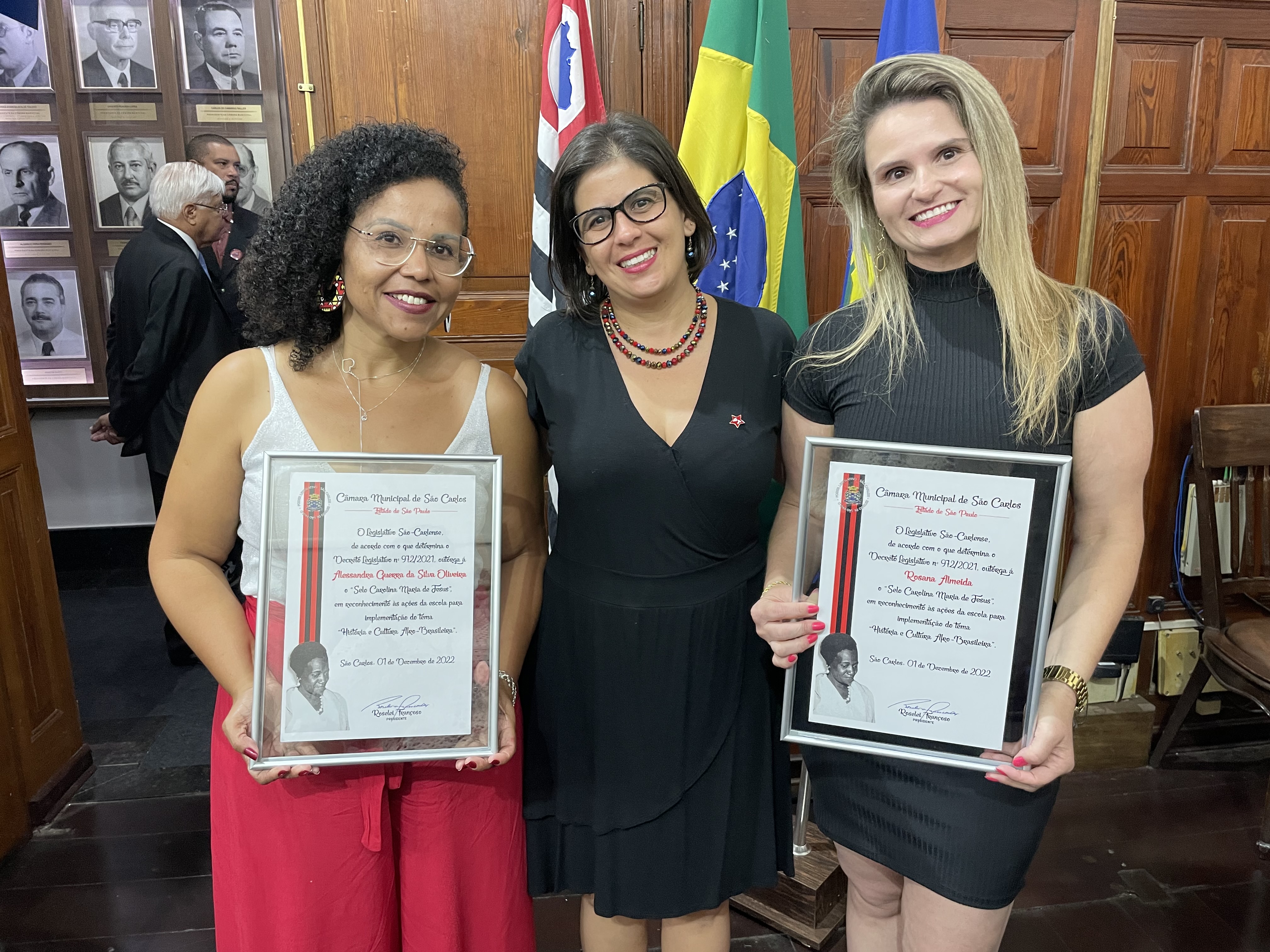 A Câmara Municipal de São Carlos realizou na última quinta-feira (1) no Edifício Euclides da Cunha a sessão solene de entrega do “Selo Carolina Maria de Jesus” para uma instituição de ensino e um profissional da educação pelo desenvolvimento de ações de promoção da igualdade racial no âmbito da educação, e o “Prêmio Chica Lopes” a personalidades negras que contribuíram de forma relevante para o desenvolvimento e promoção da igualdade étnico-racial no município.