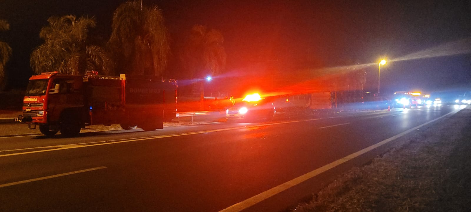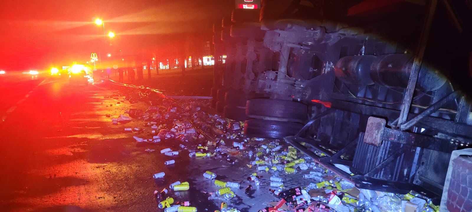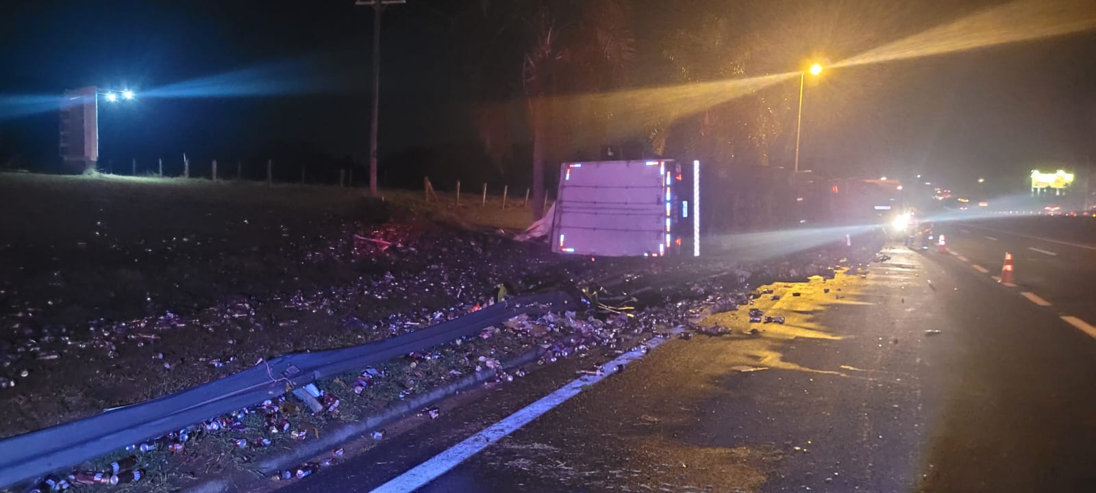 Um caminhão carregado com cerveja tombou na noite desta sexta-feira, 14 de junho de 2024, no km 222 da rodovia Washington Luís, São Carlos-SP.