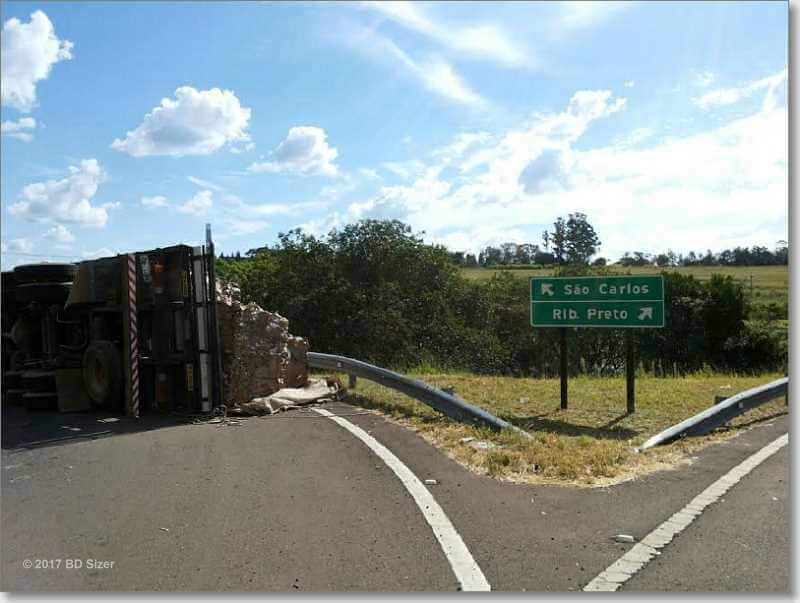 Aparecido Teixeira Soares, de 37 anos, teve um susto nesta tarde de segunda-feira, 03-04-2017, após seu caminhão tombar na alça de acesso da rodovia Washington Luís, com a SP-318, São Carlos-SP.