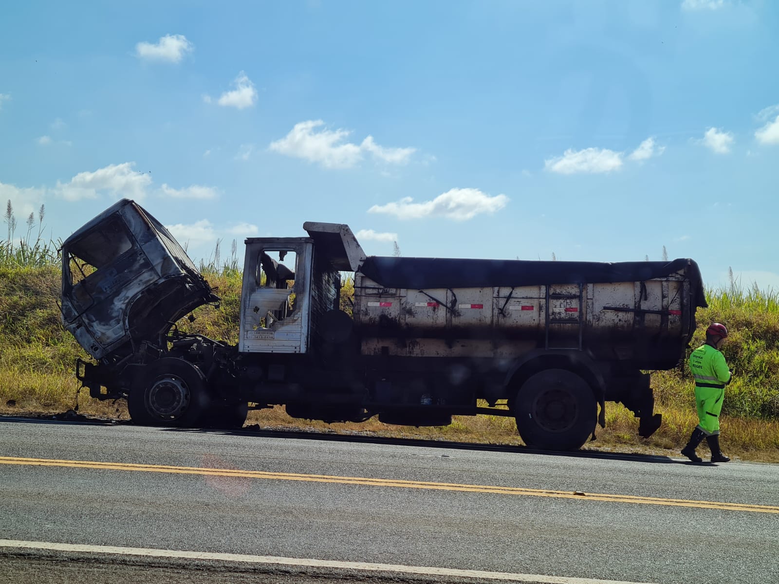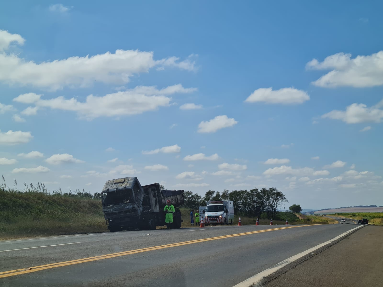 Um caminhão carregado com massa asfáltica pegou fogo nesta tarde de sábado, 29 de julho de 2023, no km 131 da rodovia Dr. Paulo Lauro (SP-215), entre São Carlos e Descalvado.